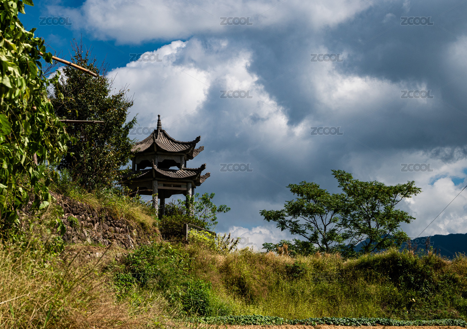 中國(guó)浙江金華塔石山間古亭與藍(lán)天白云