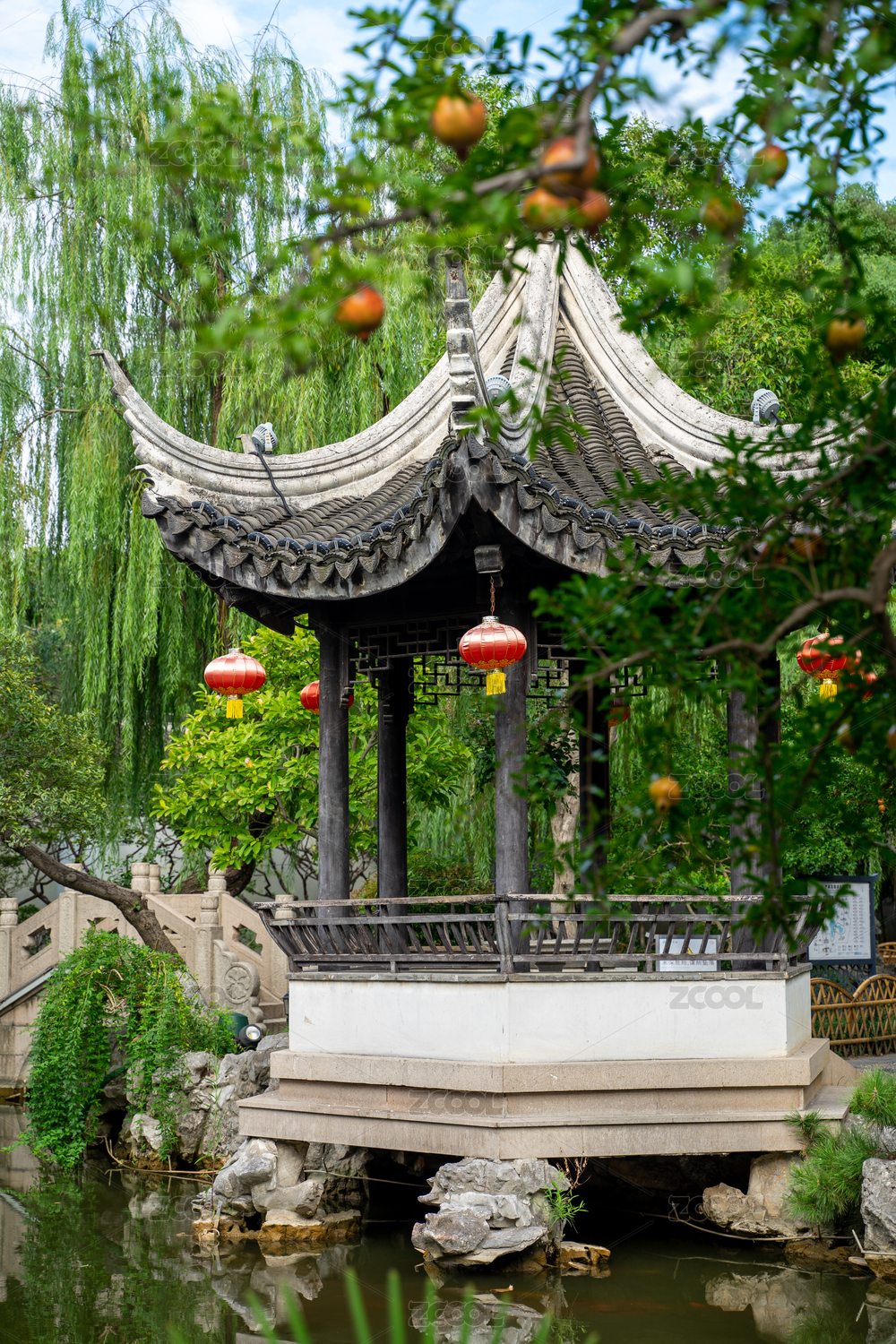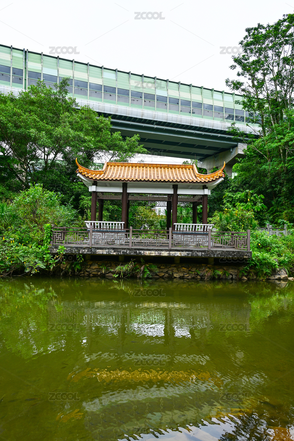 深圳仙湖植物園園林古亭與現(xiàn)代天橋融合景觀
