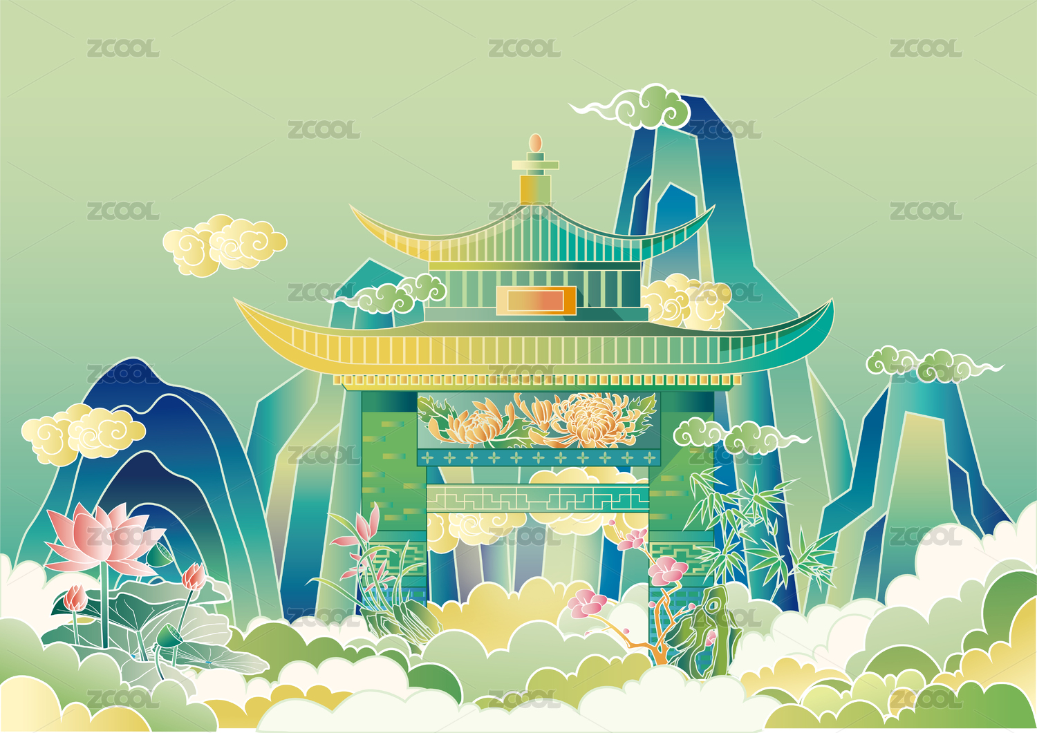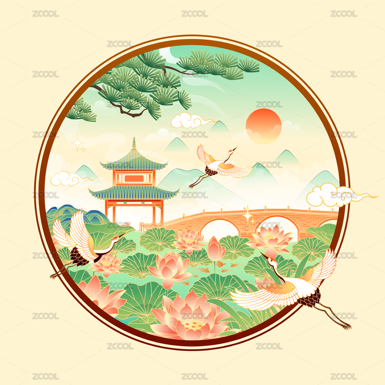 國(guó)風(fēng)山水古亭園林風(fēng)景矢量插畫(huà)