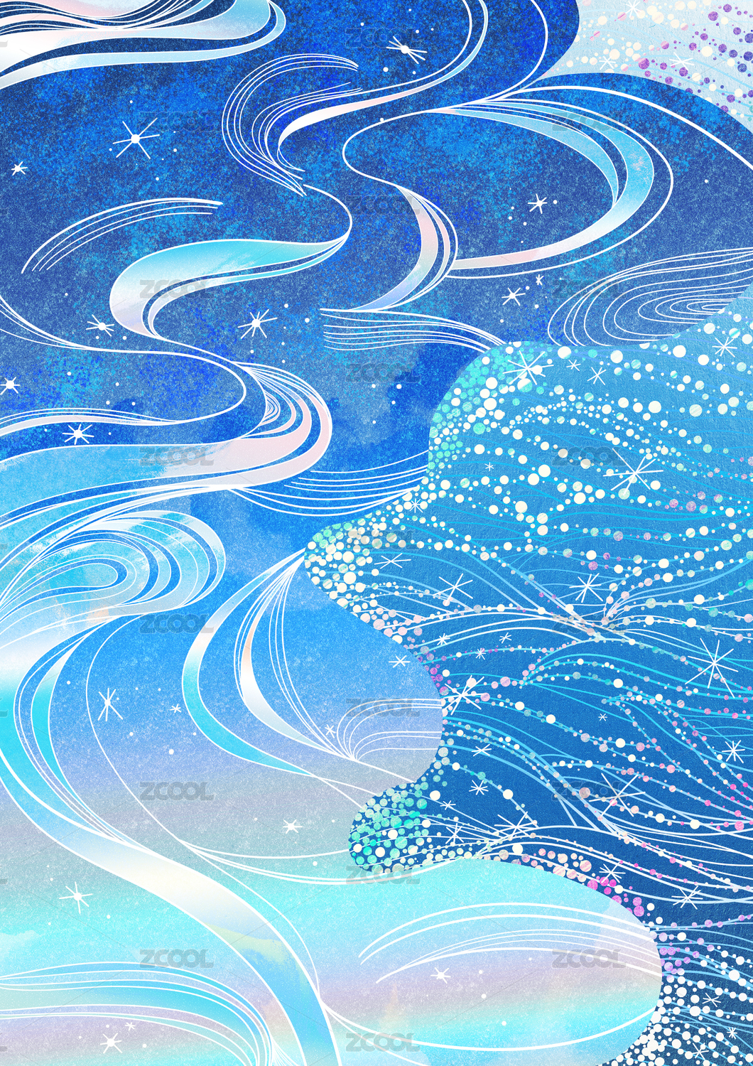 冰藍色雪花線條構(gòu)成的河水和波光粼粼帶著閃光珠點的海大雪節(jié)氣精美色彩漸變花紋花樣組成的插畫圖素材設(shè)計