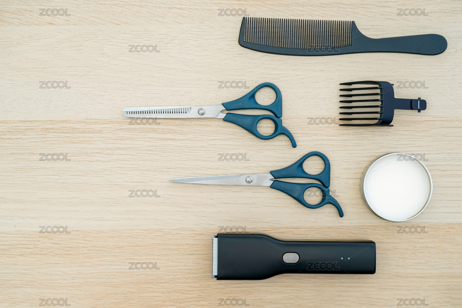 理發(fā)店中的電動理發(fā)器和剪刀以及胡刷