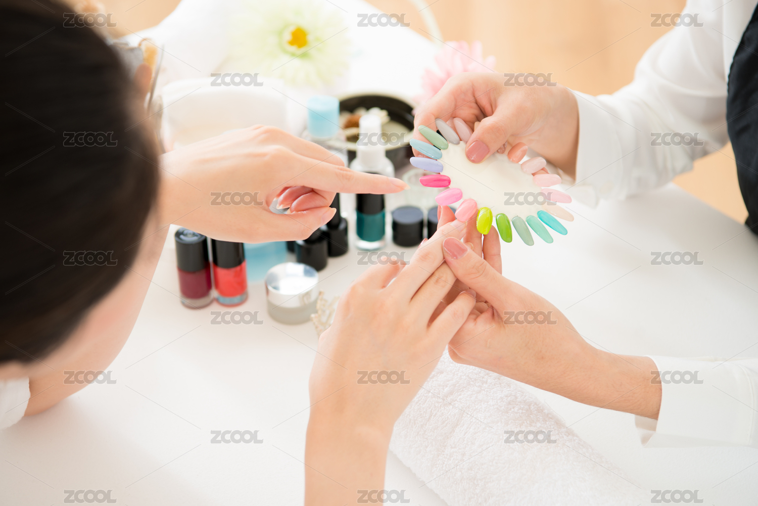 亞洲的中國女人頂視圖選擇美甲顏色蟲膠指甲油。美甲師展示的美甲服務(wù),美容美發(fā)調(diào)色板。
