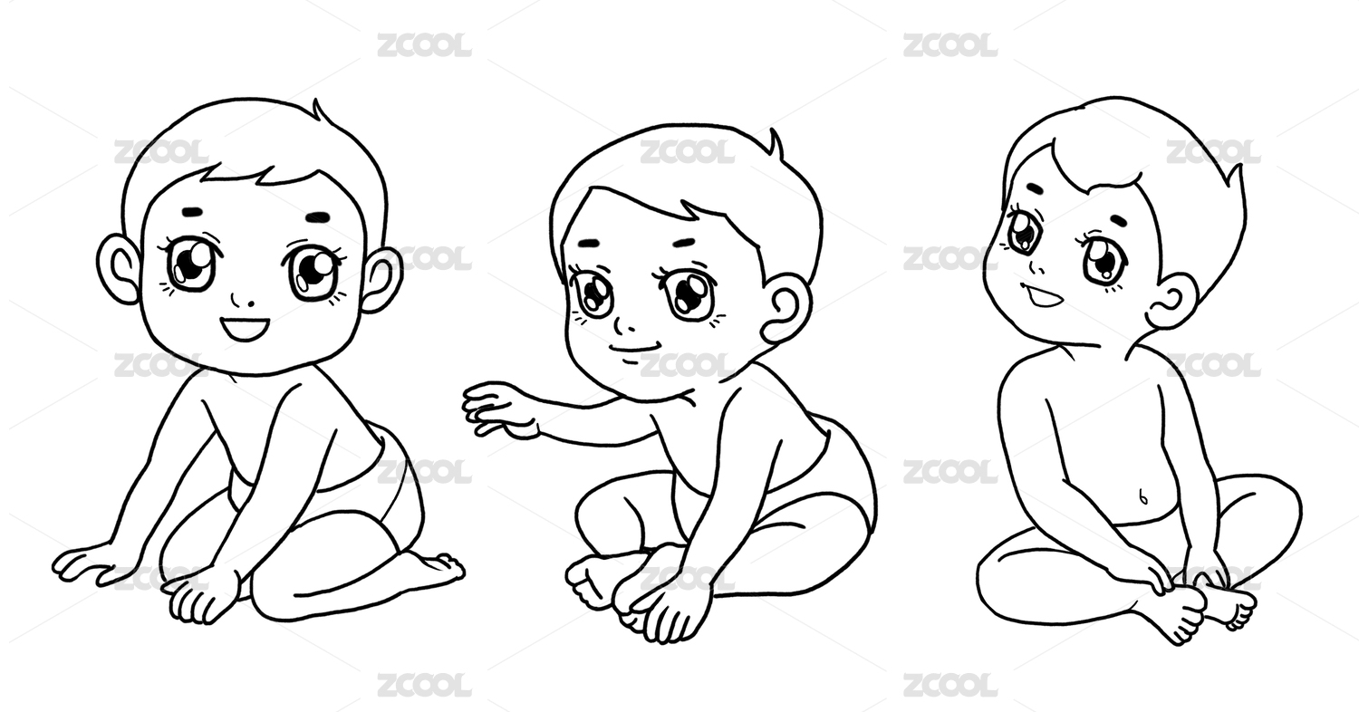 可愛的嬰兒穿著尿布坐在地上 線條手繪插畫