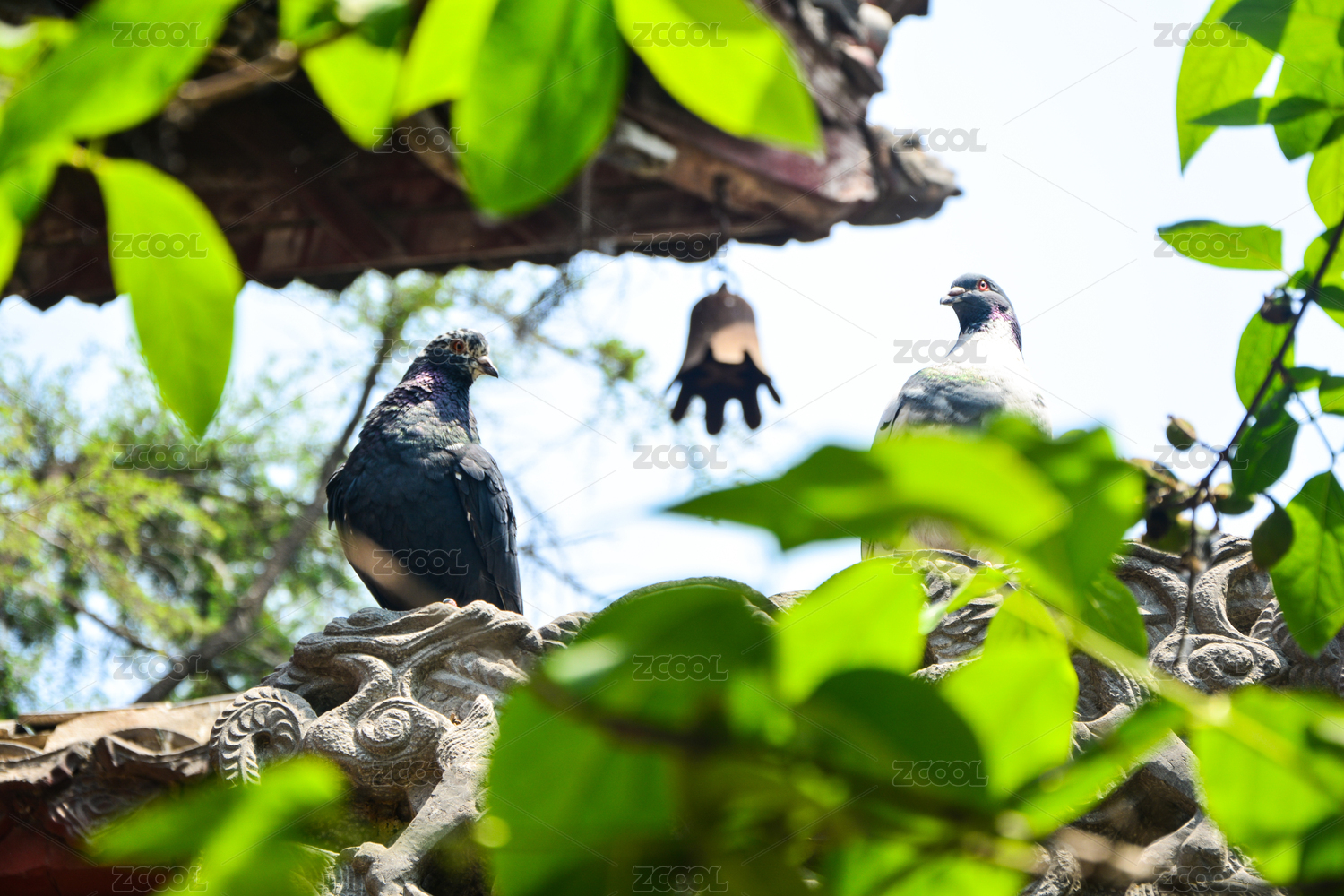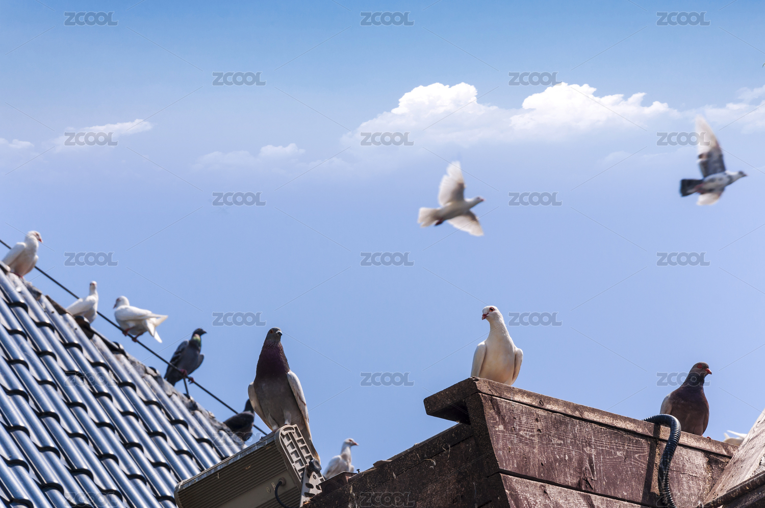 鴿子窩公園屋頂上站立成群和藍(lán)天白云下飛翔的鴿子