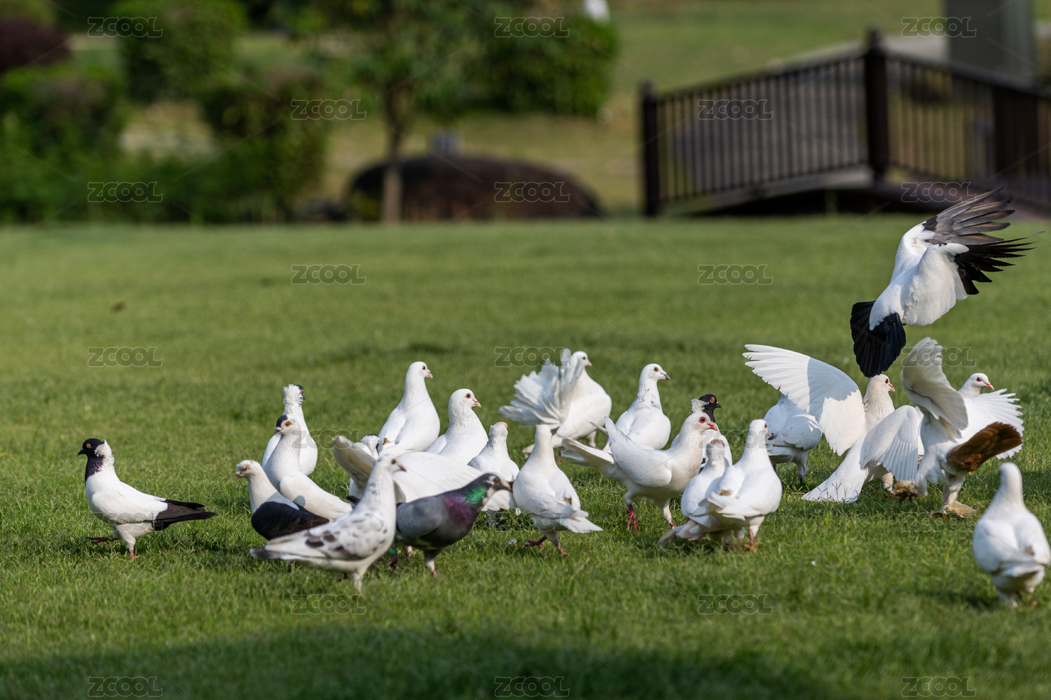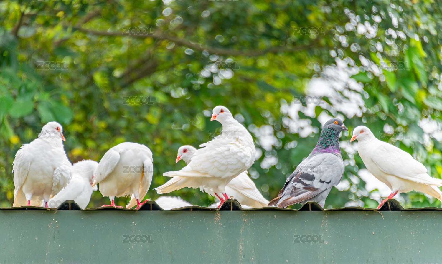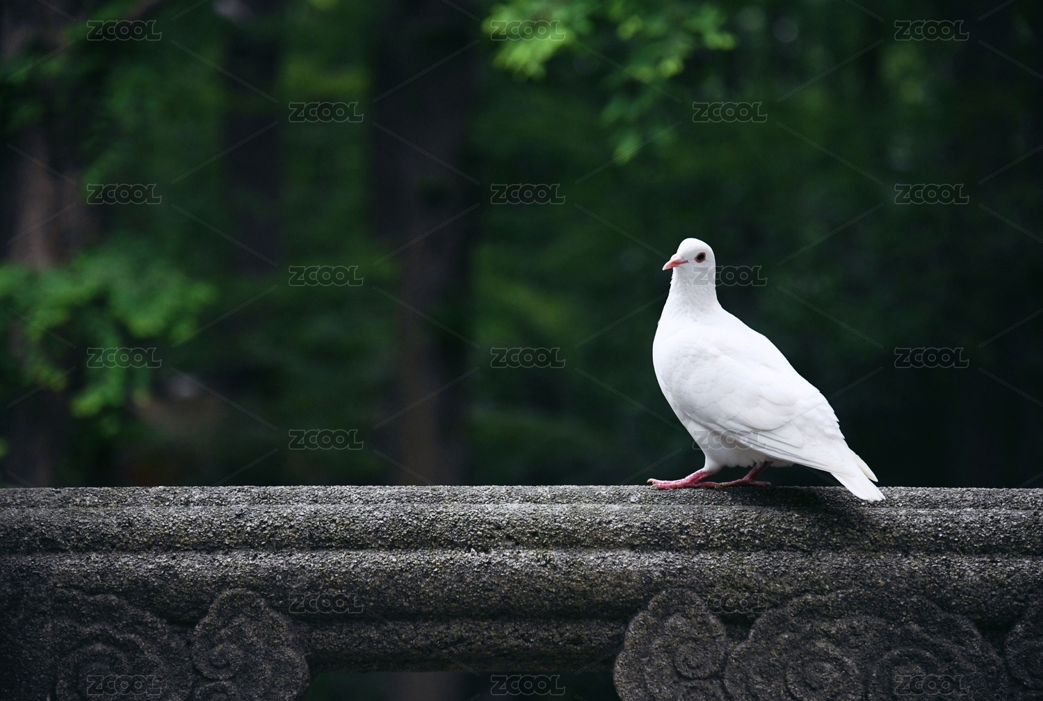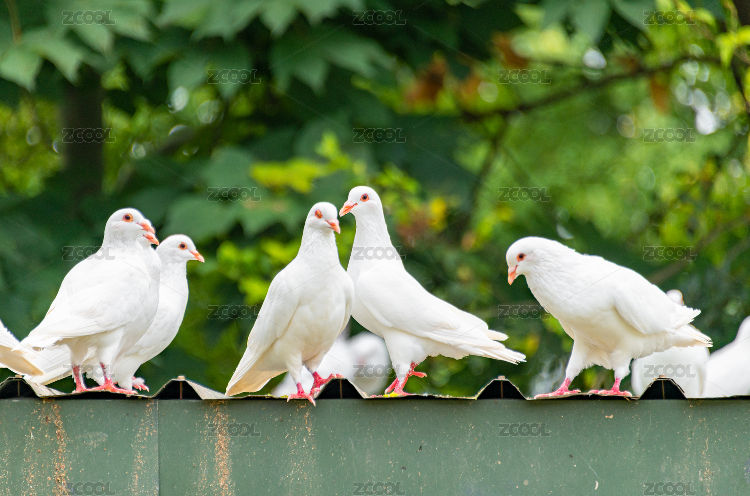 公園綠色樹(shù)林里欄桿上可愛(ài)的白色鴿子