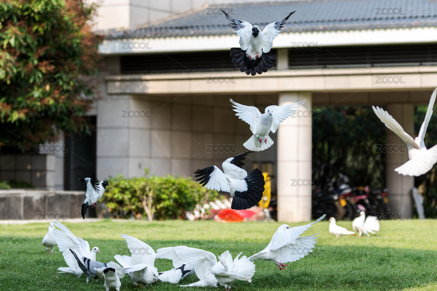 公園草地上的一群鴿子