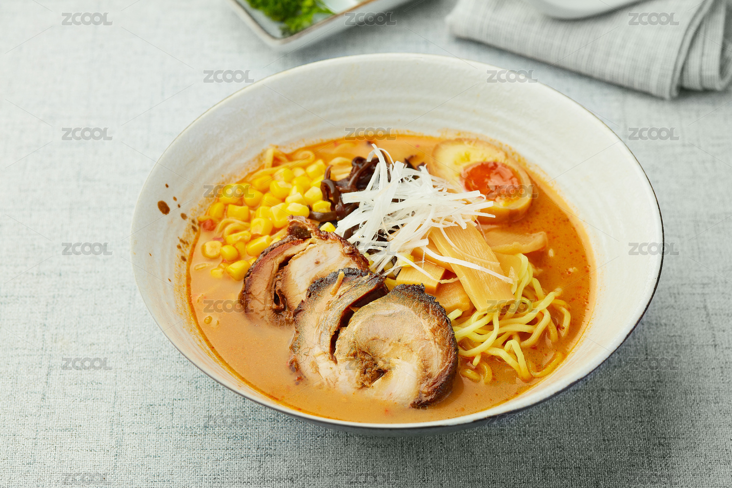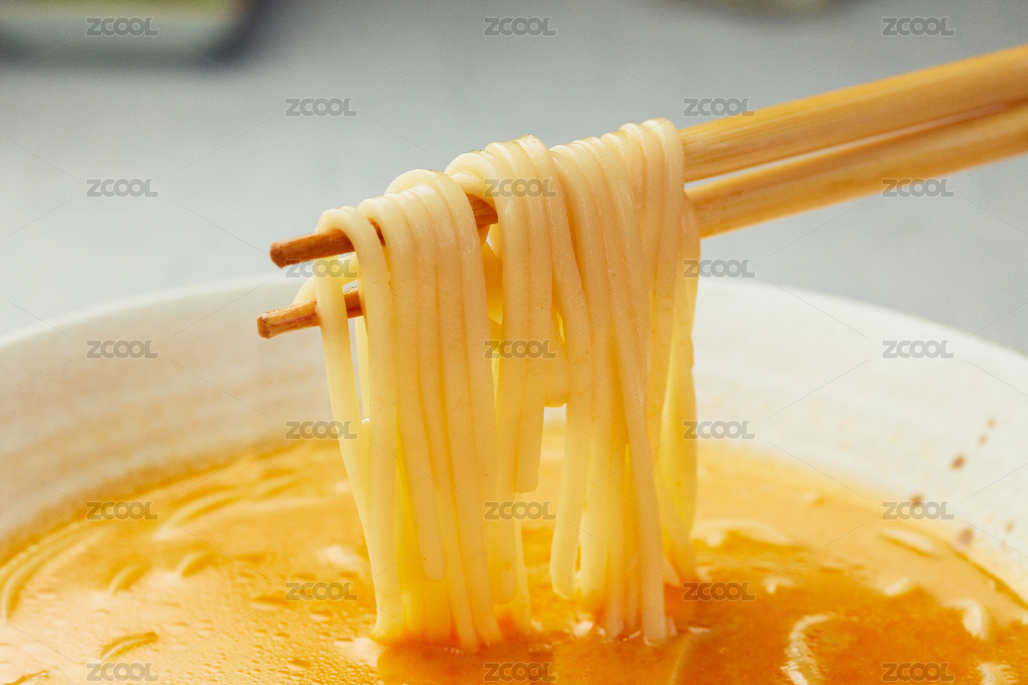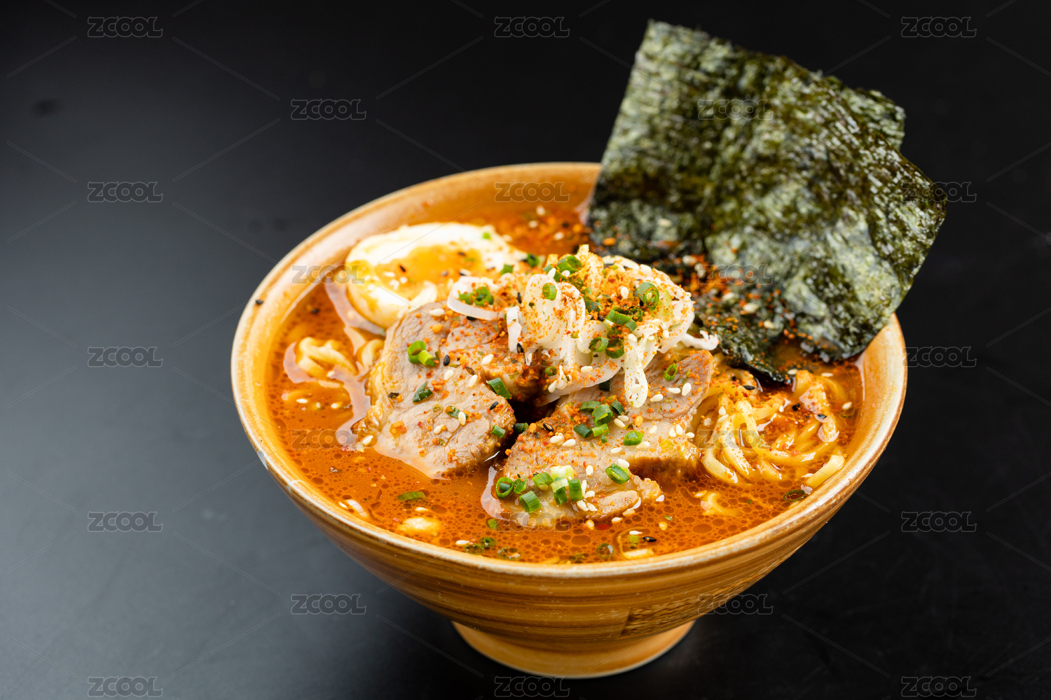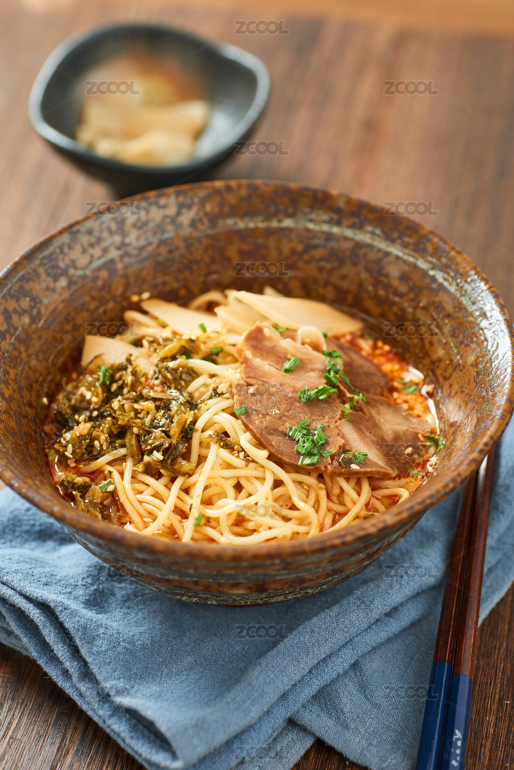 藏藍(lán)色餐布上的一碗地獄拉面,配著一個(gè)木勺