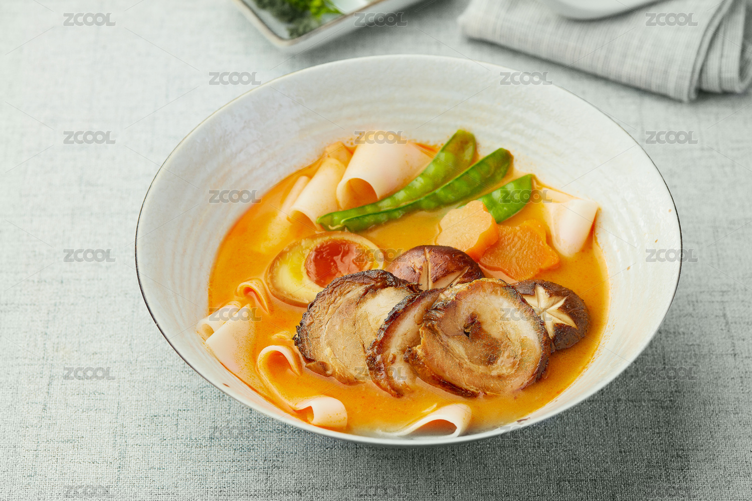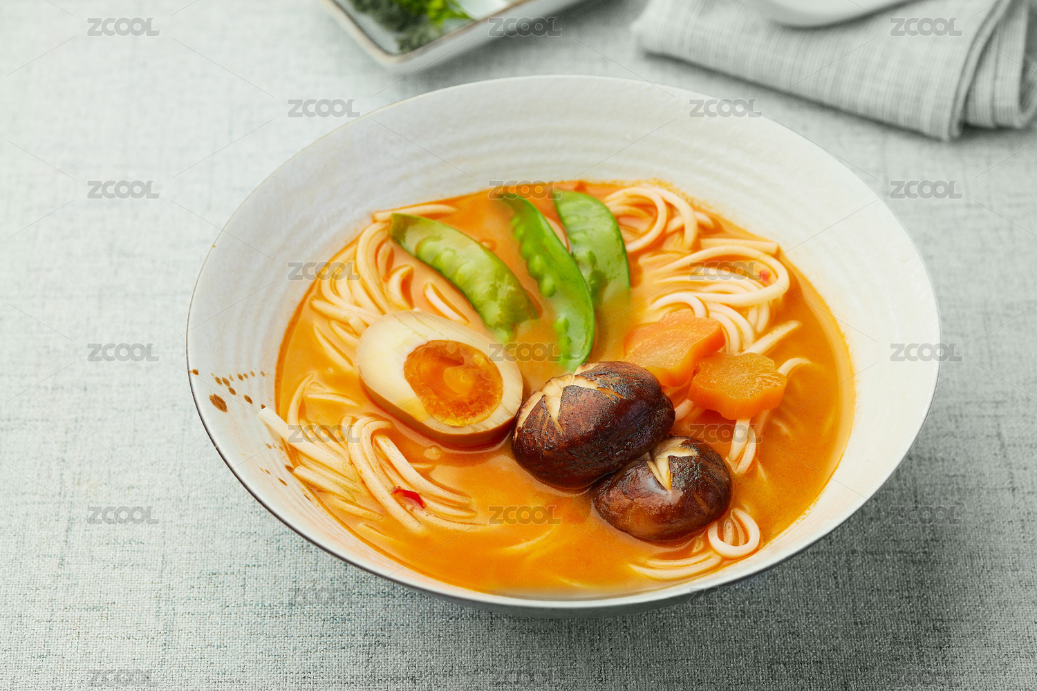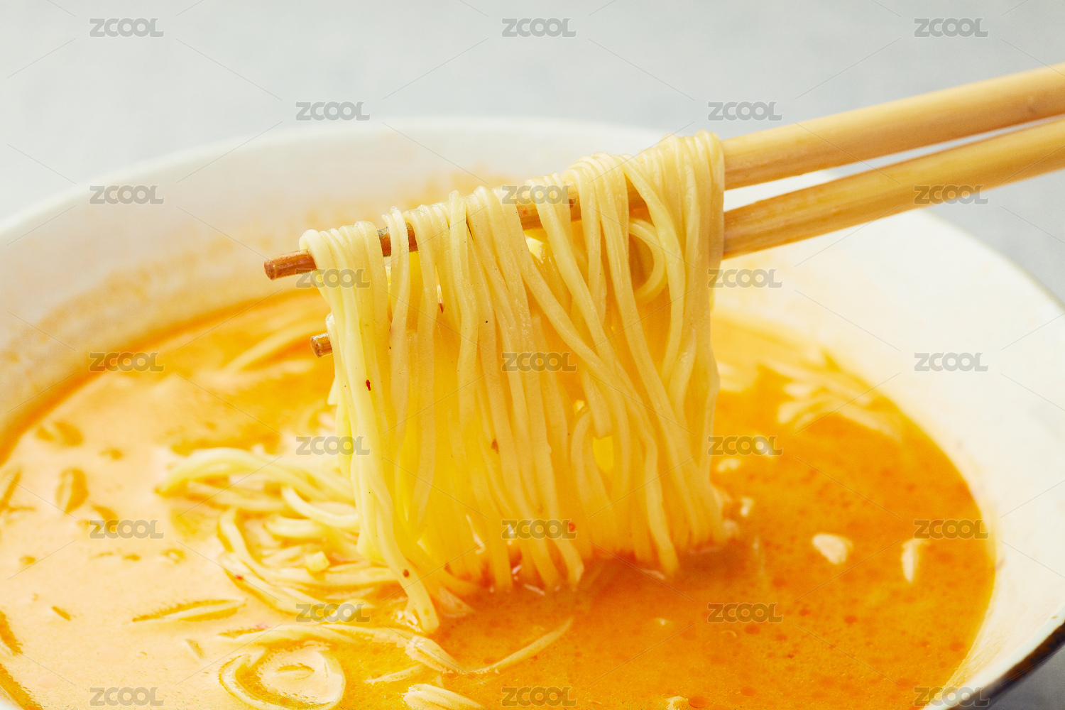 藏藍(lán)色餐布上的一碗地獄拉面,配著一個(gè)木勺