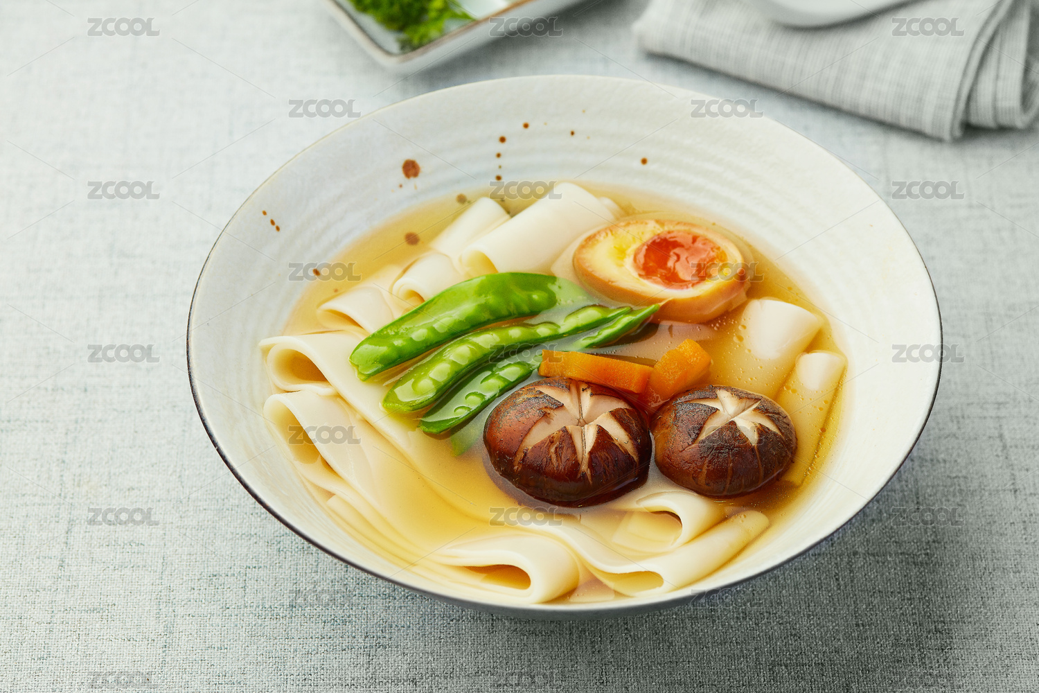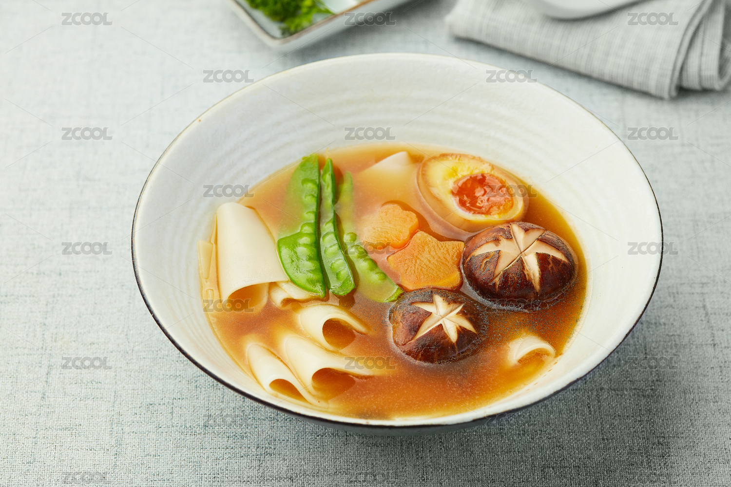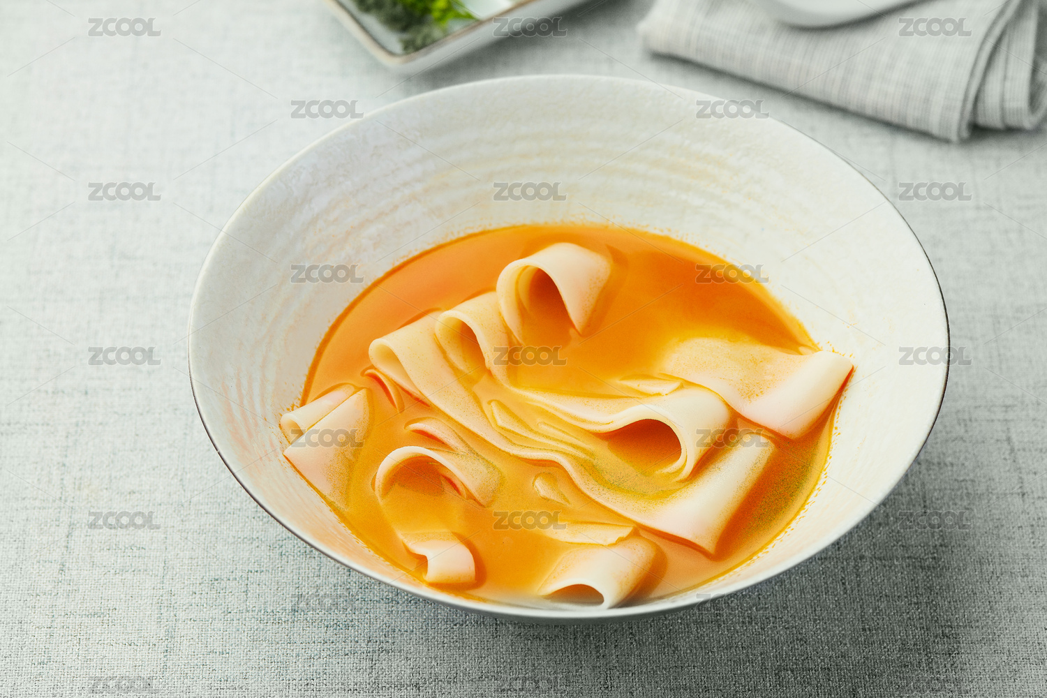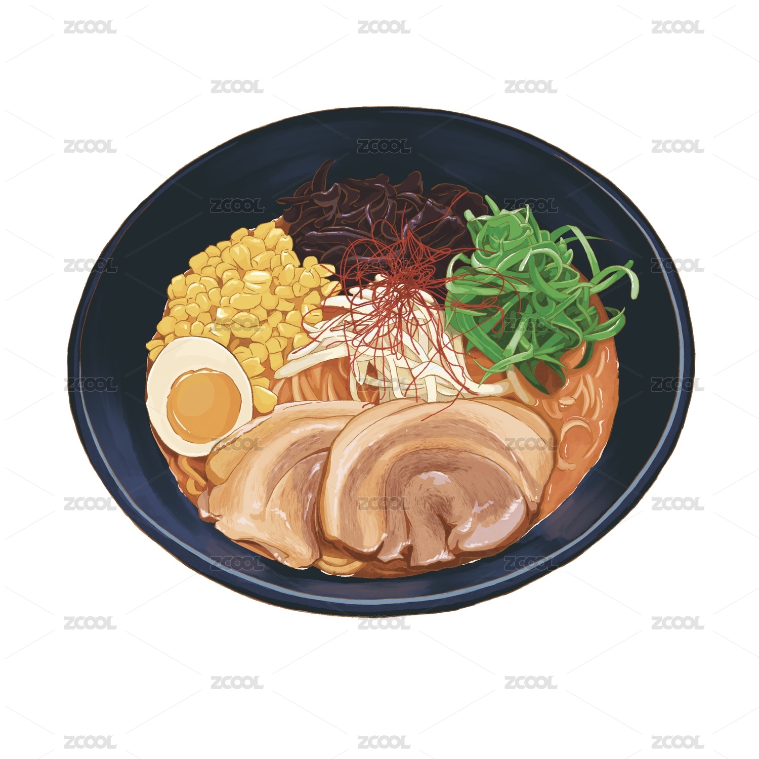藏藍(lán)色餐布上的一碗地獄拉面,配著一個(gè)木勺