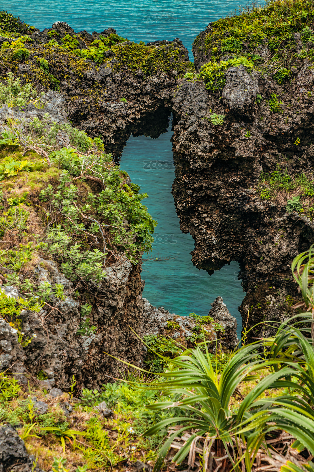 日本沖繩恩納村萬(wàn)座毛海岸公園海邊礁石綠色植物