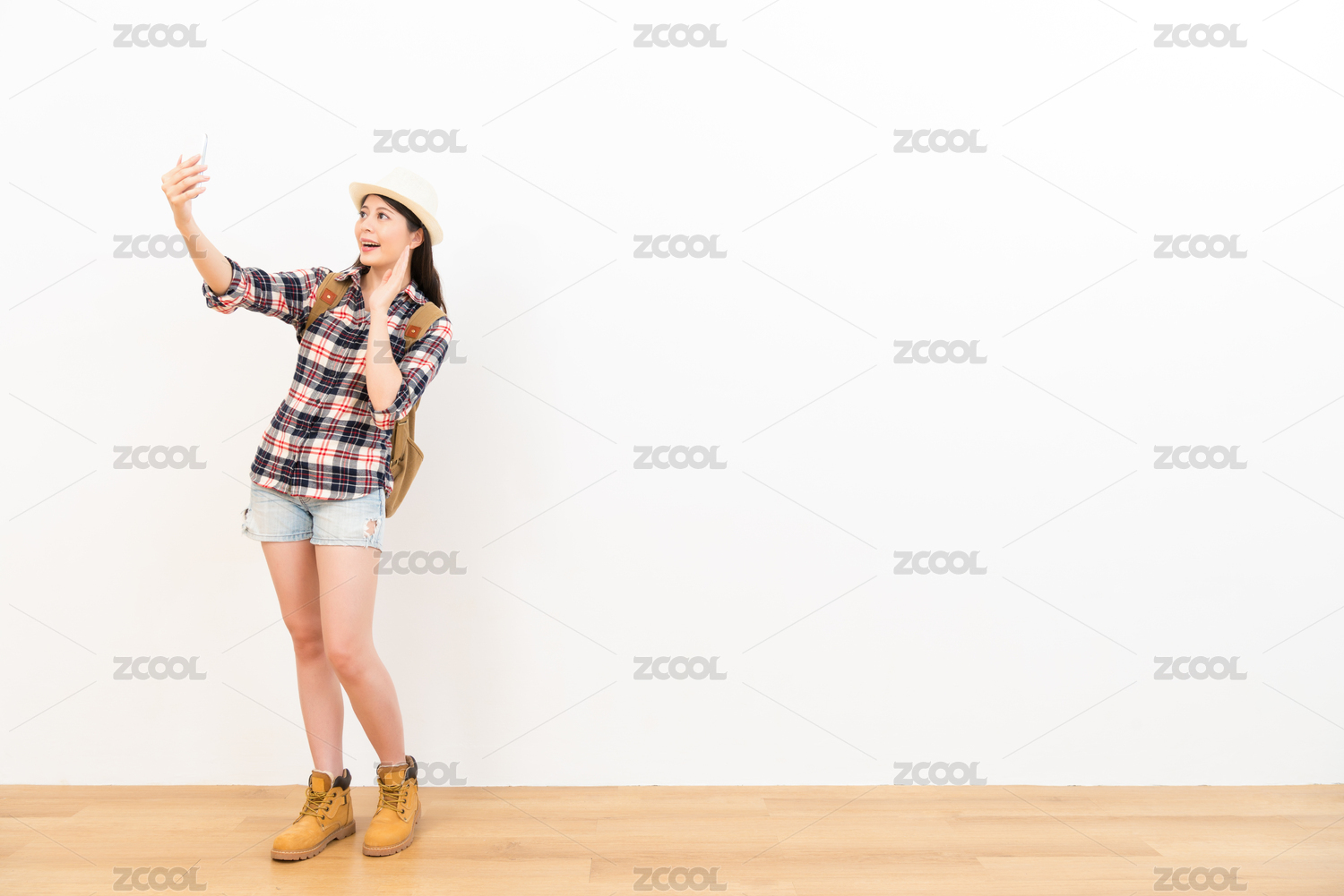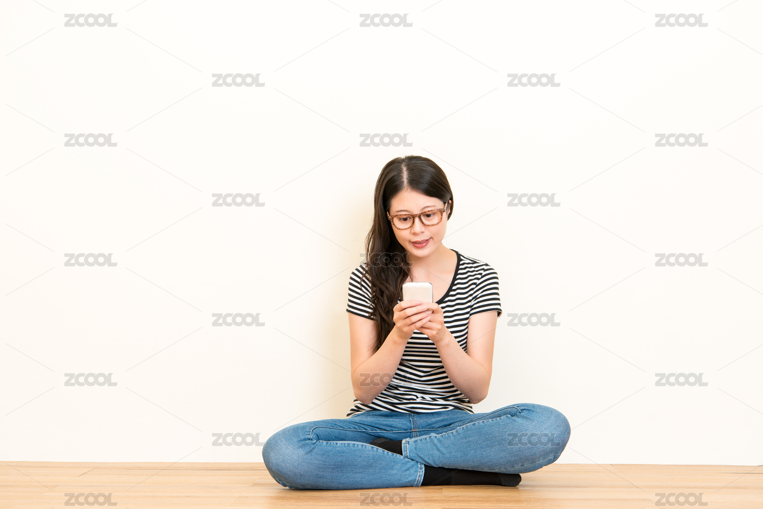 年輕美麗的姑娘用手機(jī)的FaceTime或者打字與家人在空白COPYSPACE白色的墻壁背景坐在木地板上聊天。