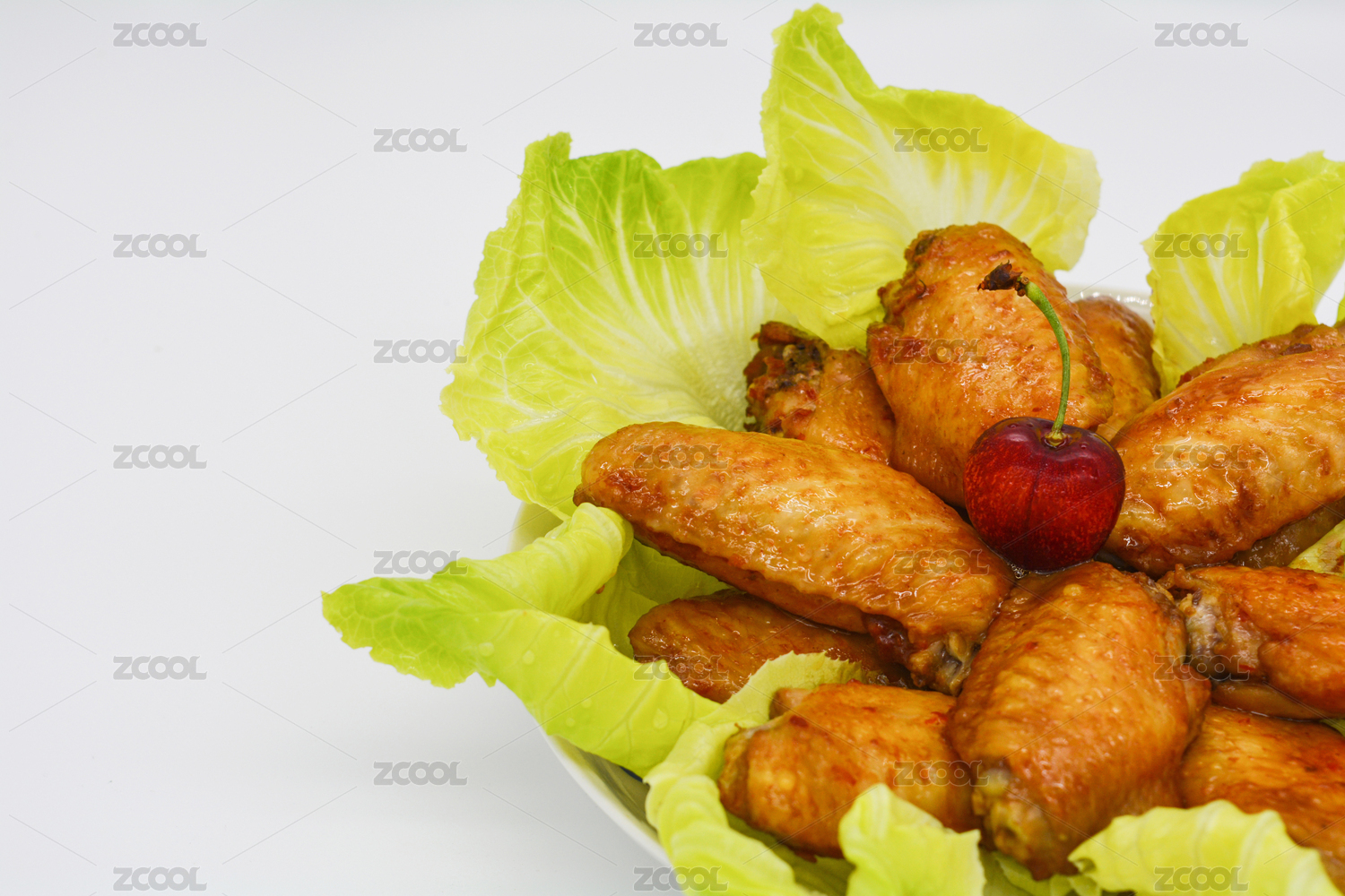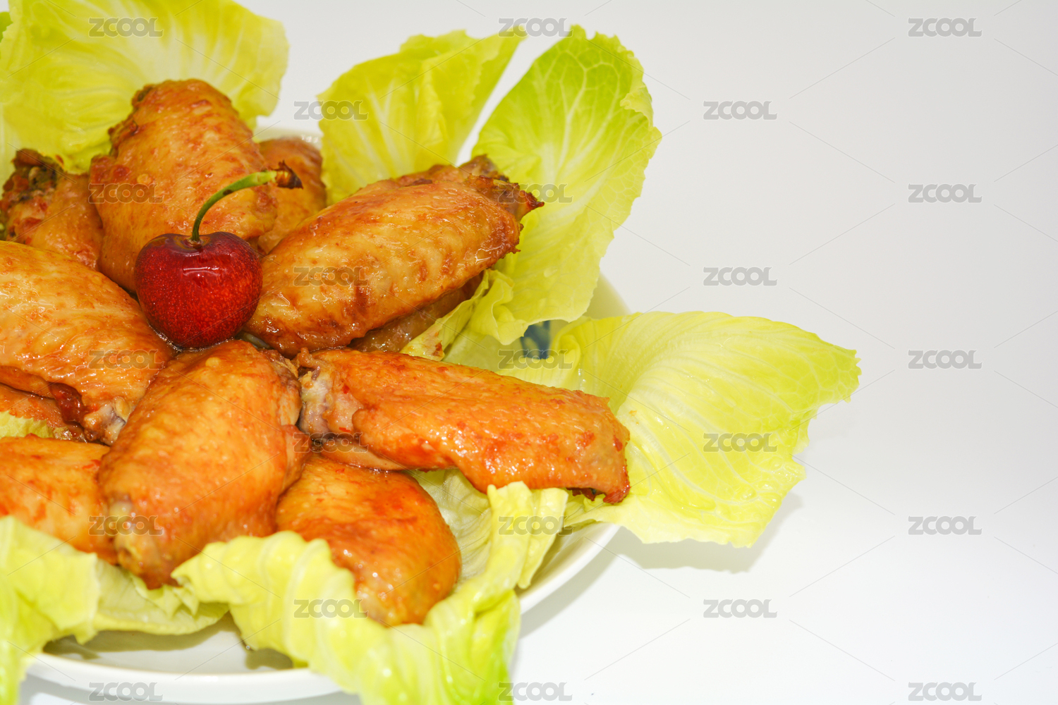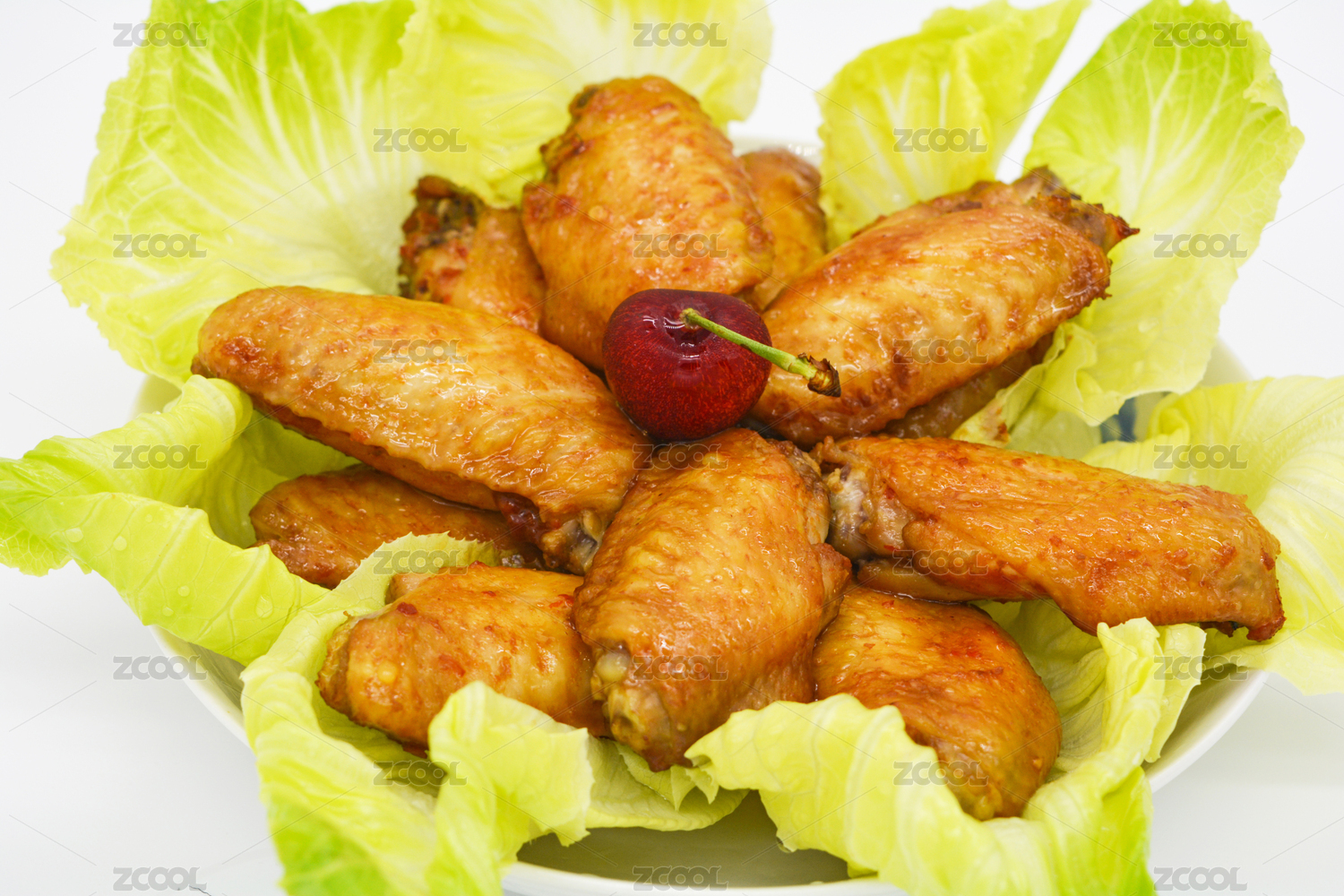 裝在盤子里的蜜汁烤翅中及生菜葉子