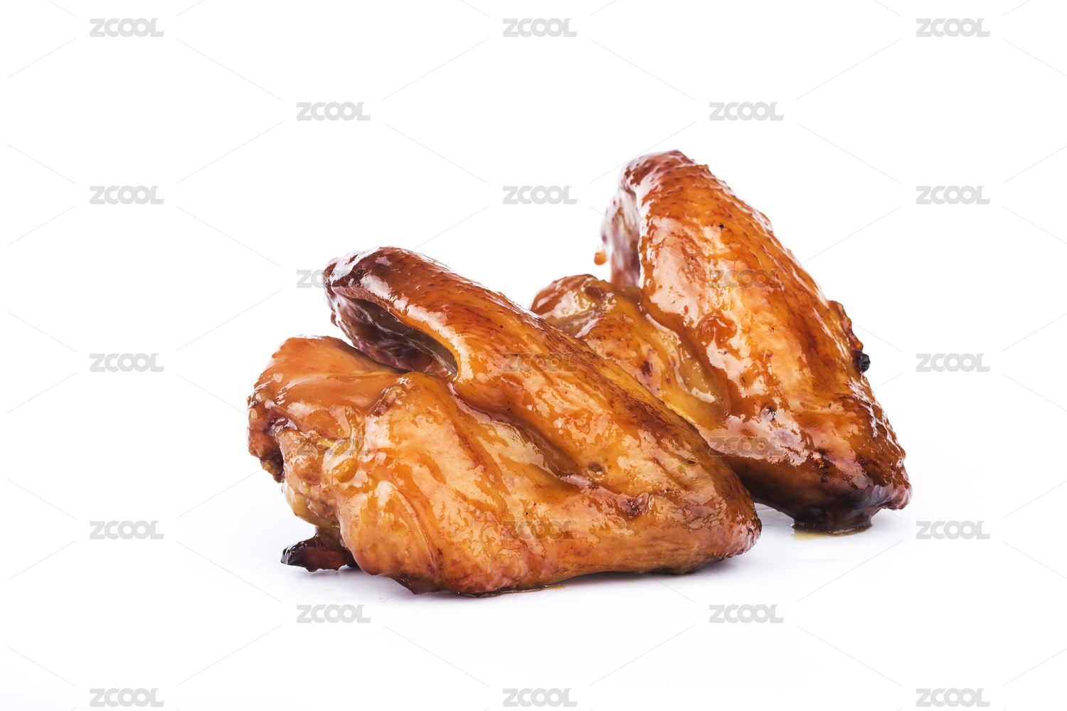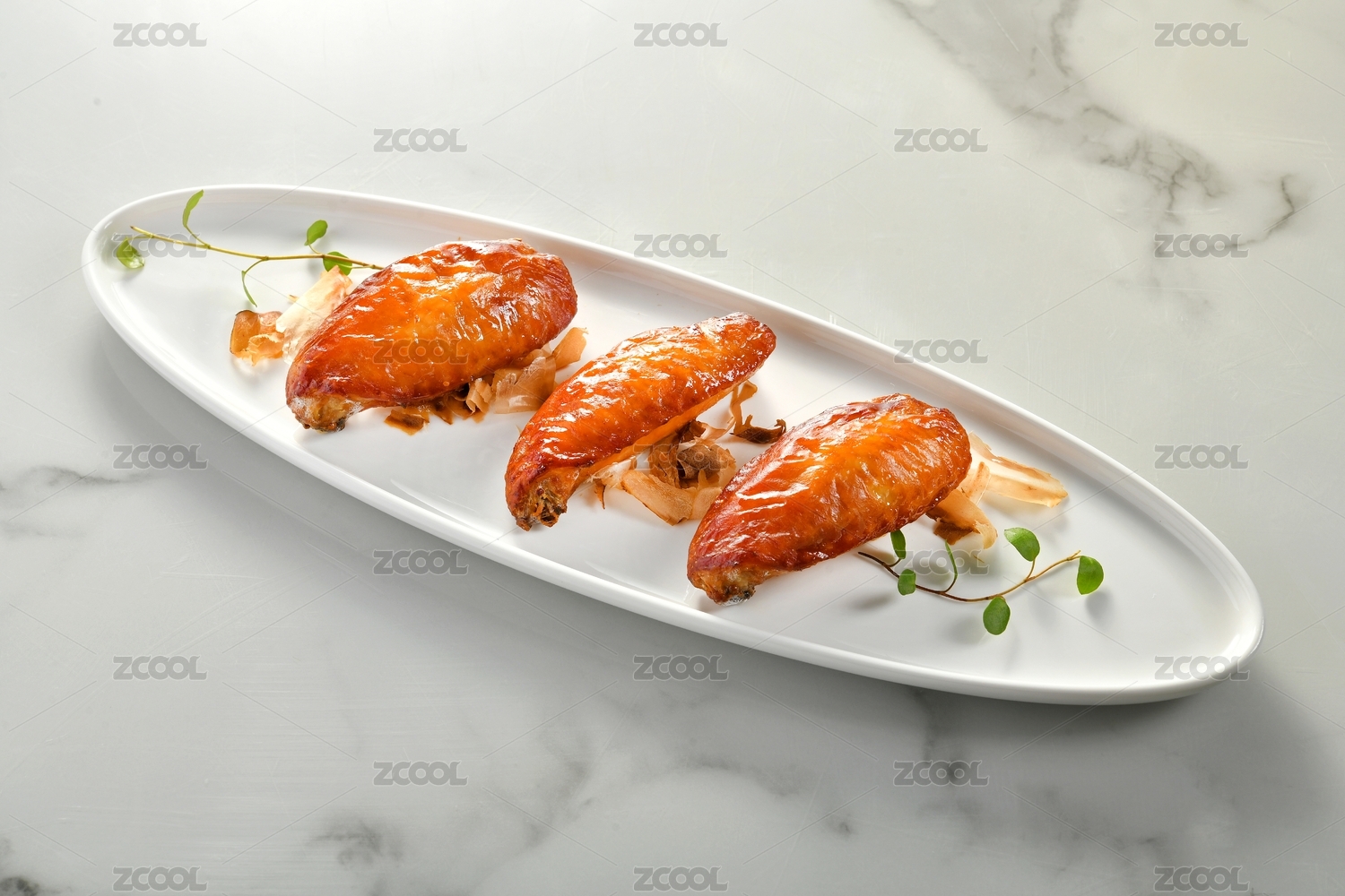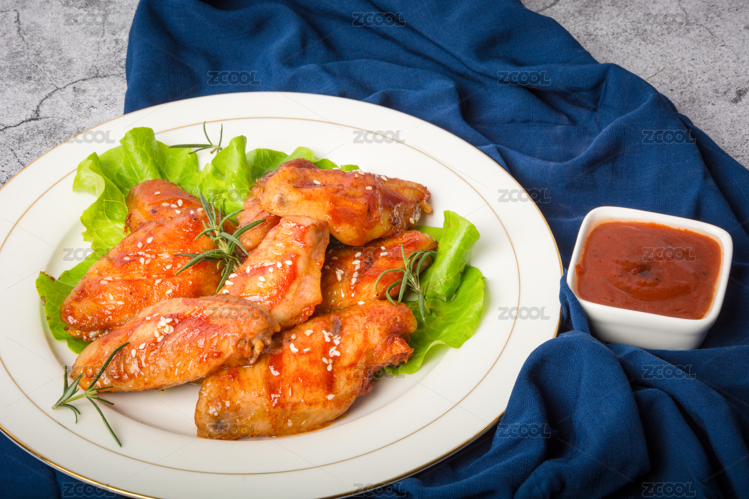 裝在盤子里的蜜汁烤翅中及生菜葉子