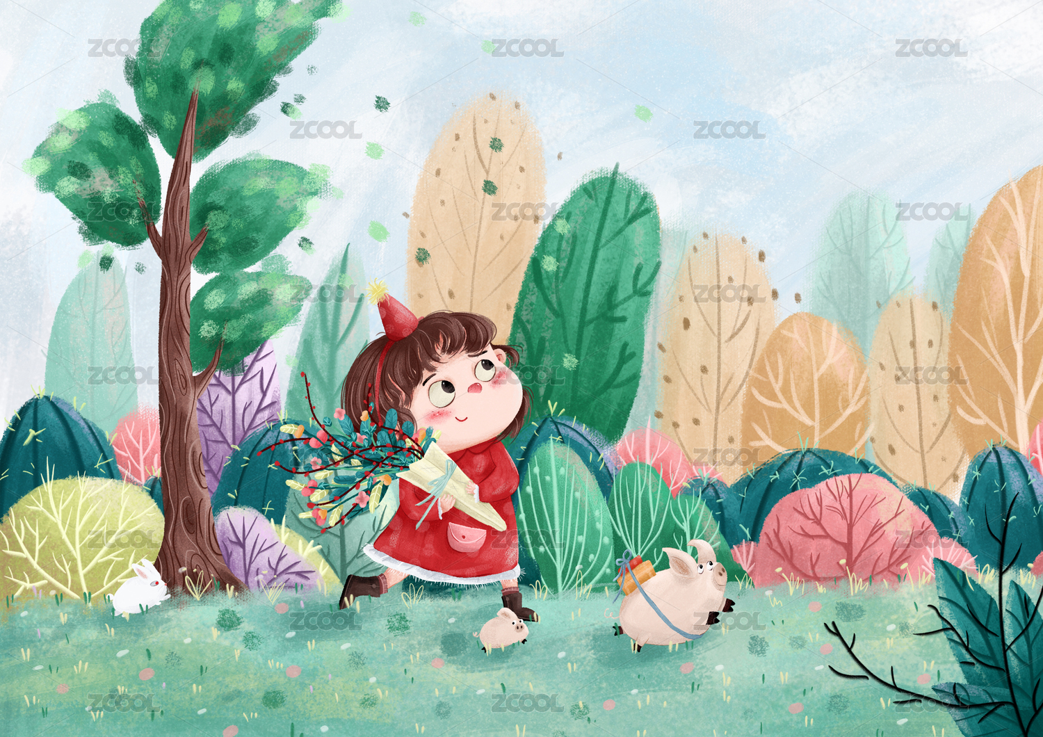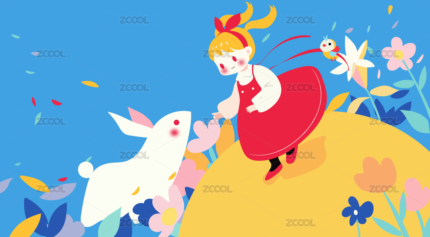 女孩與小兔卡通插畫