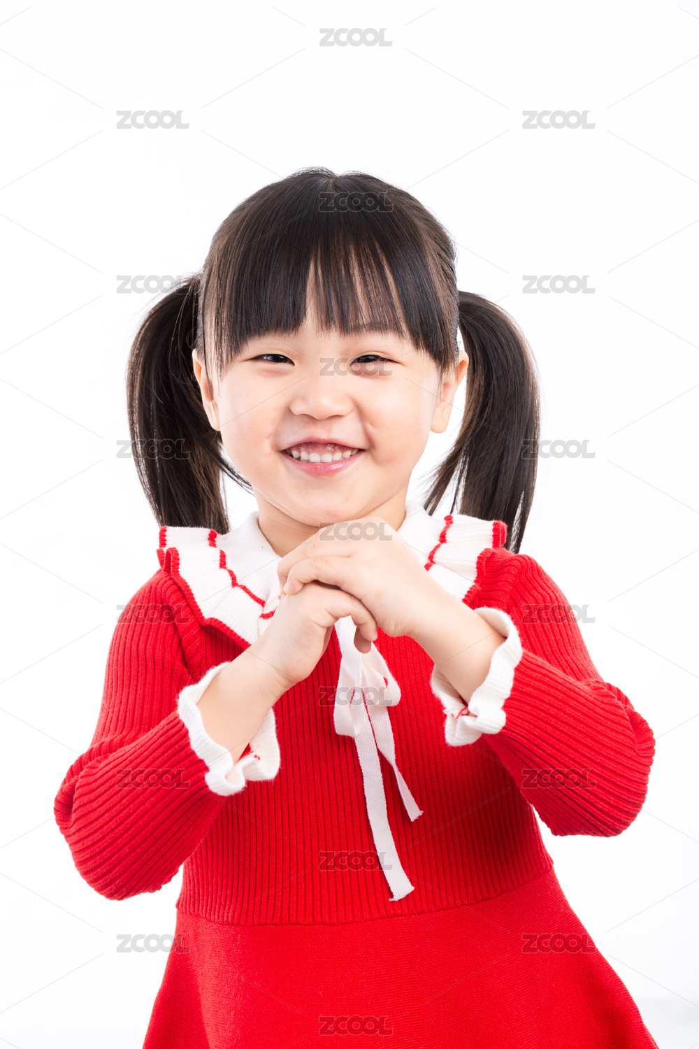 過年穿紅裙子做拜年手勢的亞洲小女孩