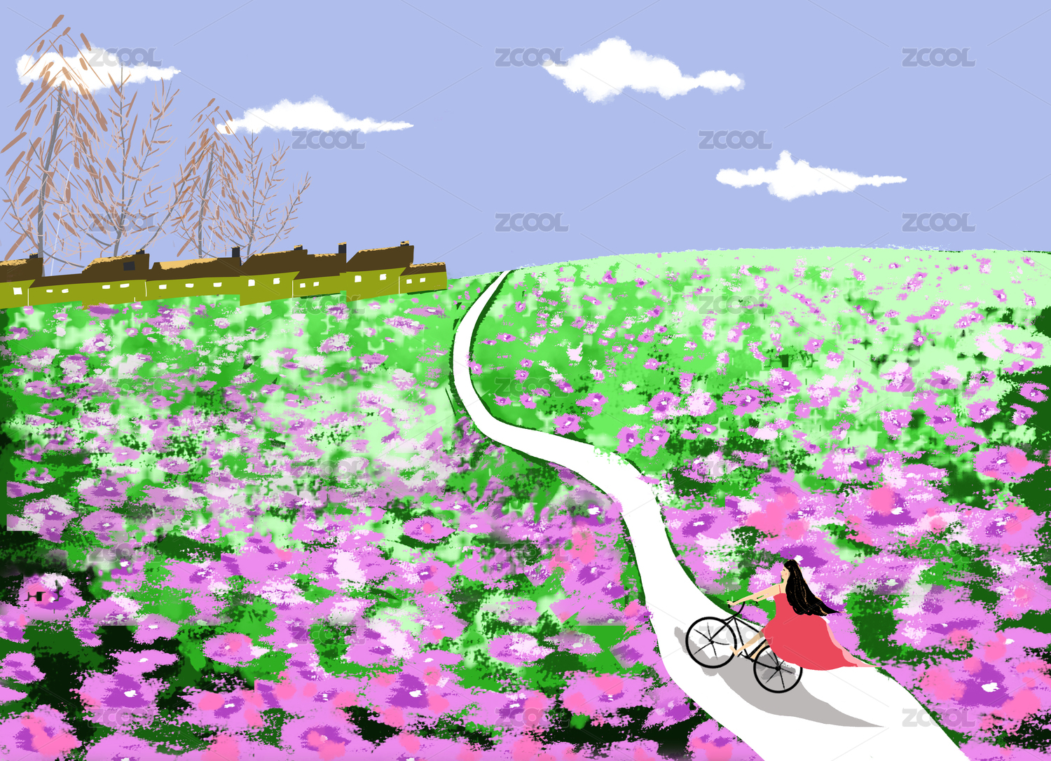 紅裙子女孩騎行在花海小路上插圖