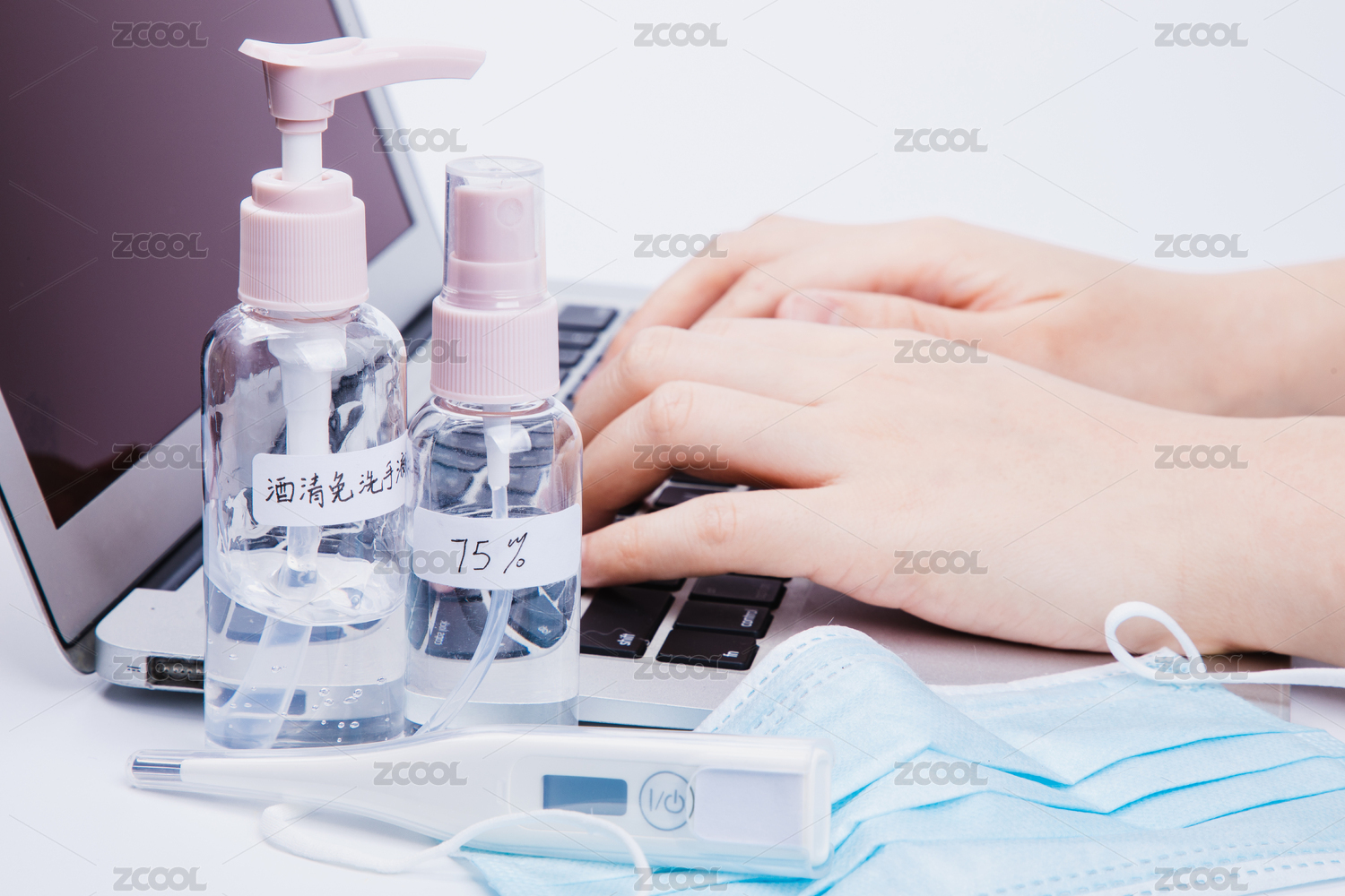 雙手在筆記本上操作旁邊放著一些消毒用品