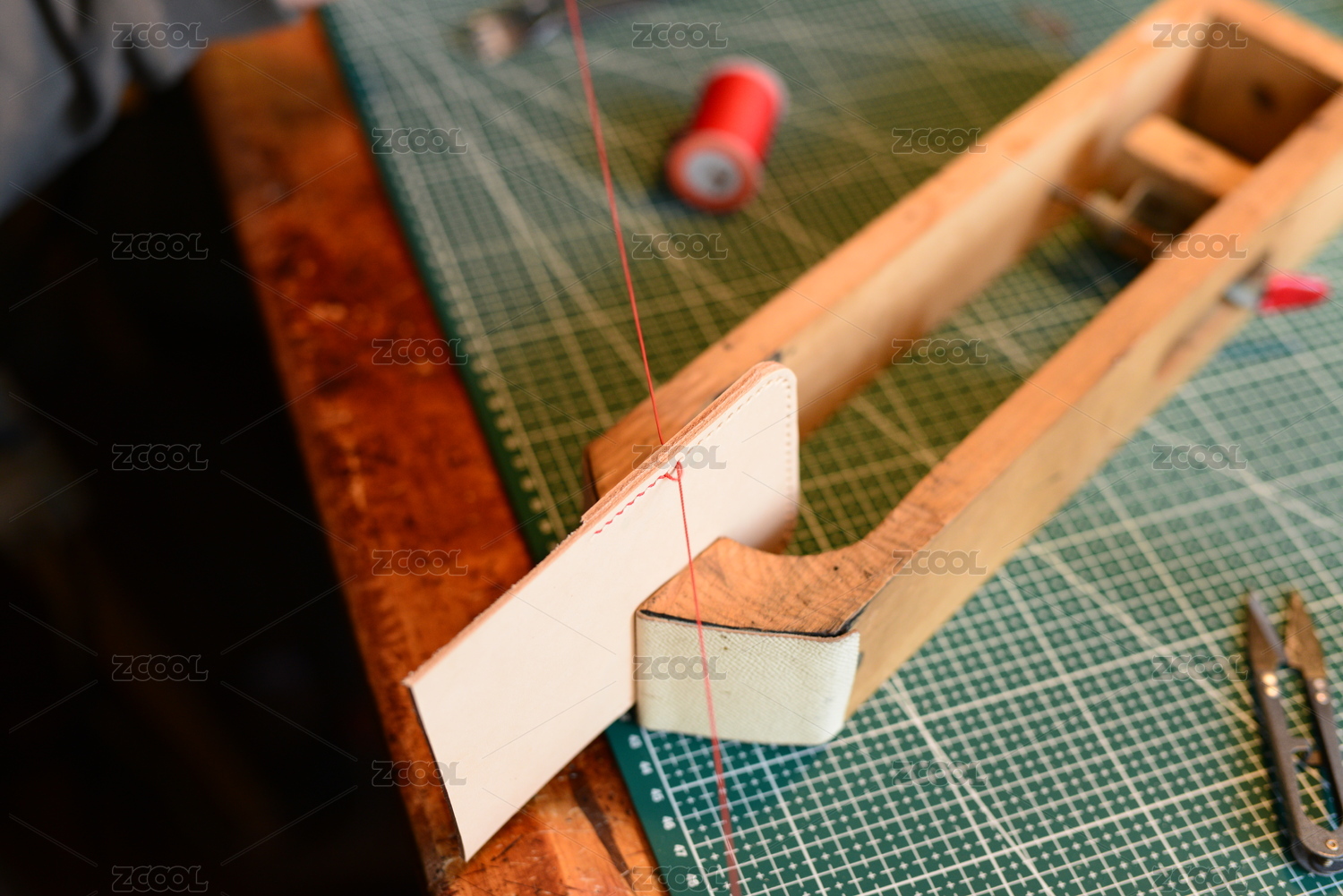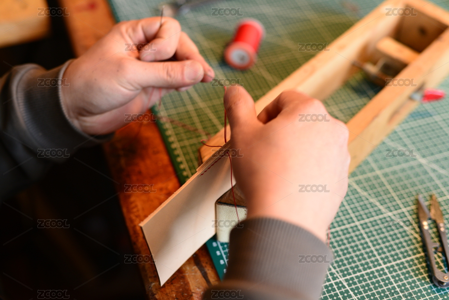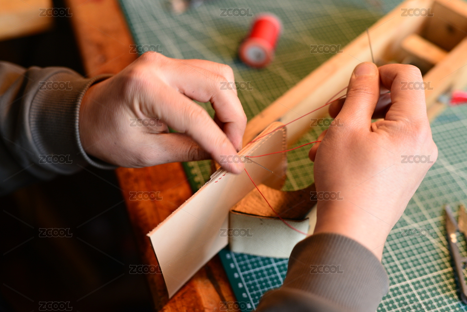 皮具設(shè)計(jì)師雙手在夾具上縫制牛皮制品