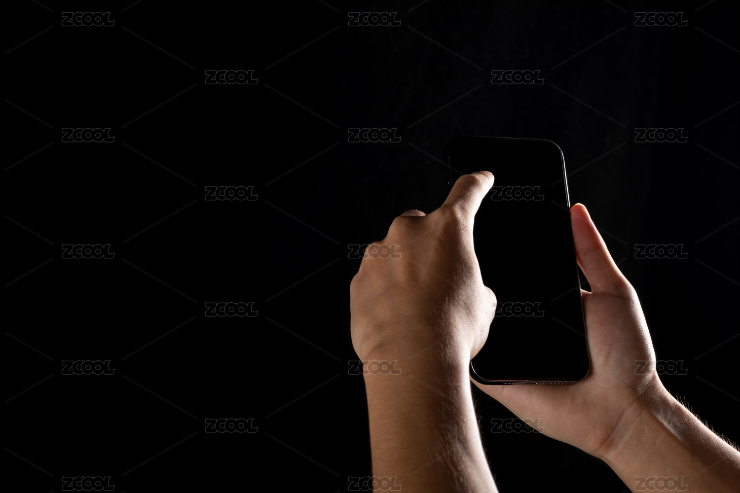 黑色背景前輪廓分明的雙手操作手機(jī)的動(dòng)作