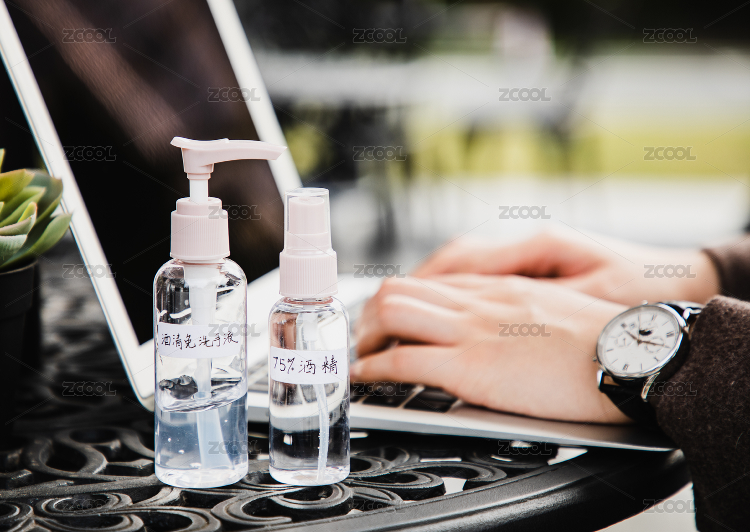 特寫雙手在筆記本電腦前操作旁邊放著酒精