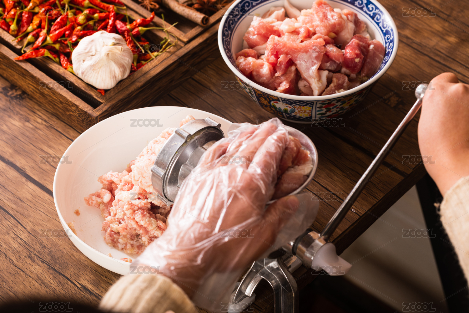 雙手操作手動(dòng)絞肉機(jī)將肥瘦相間的豬肉做成末