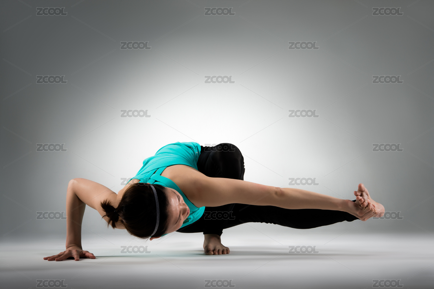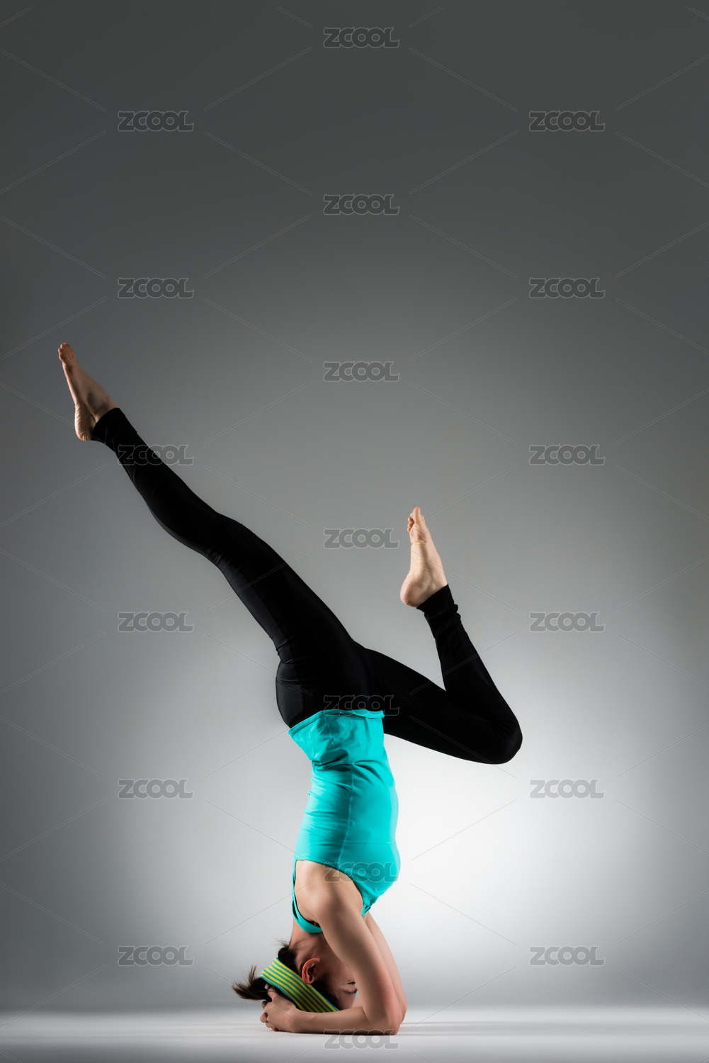 采用倒立擺在灰色的背景伸展腿和鍛煉個(gè)人的身體肌肉相當(dāng)瑜伽健身教練的女人。