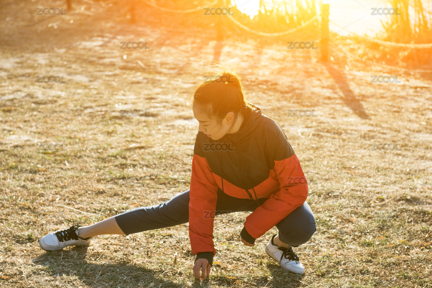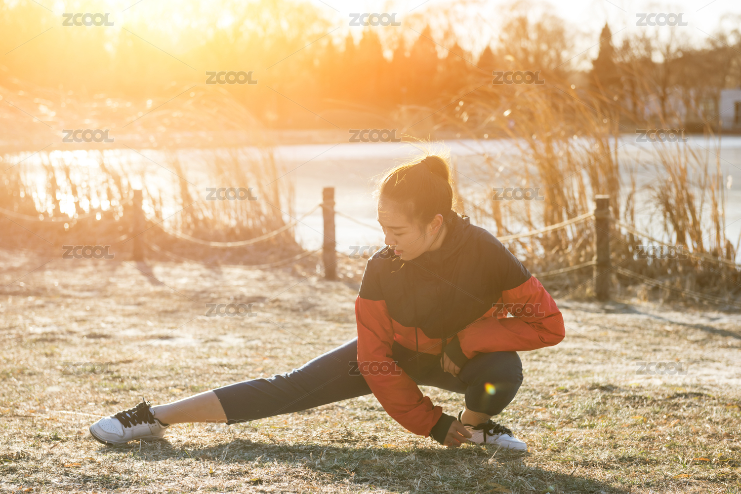年輕的女性在戶(hù)外做跑步前的熱身運(yùn)動(dòng),伸展腿部肌肉