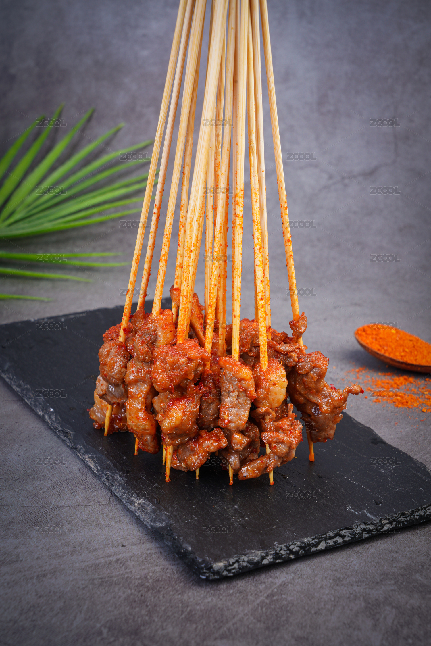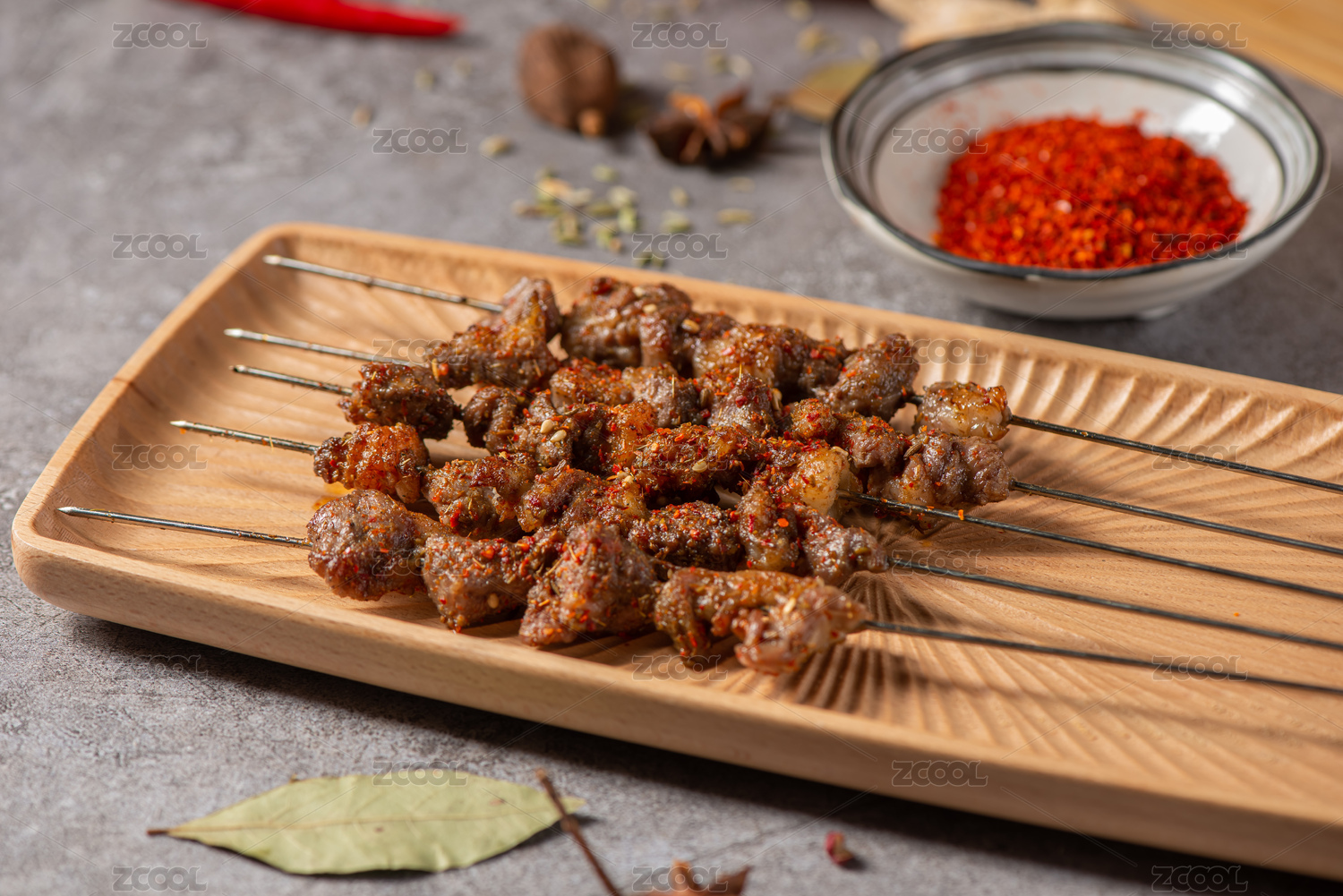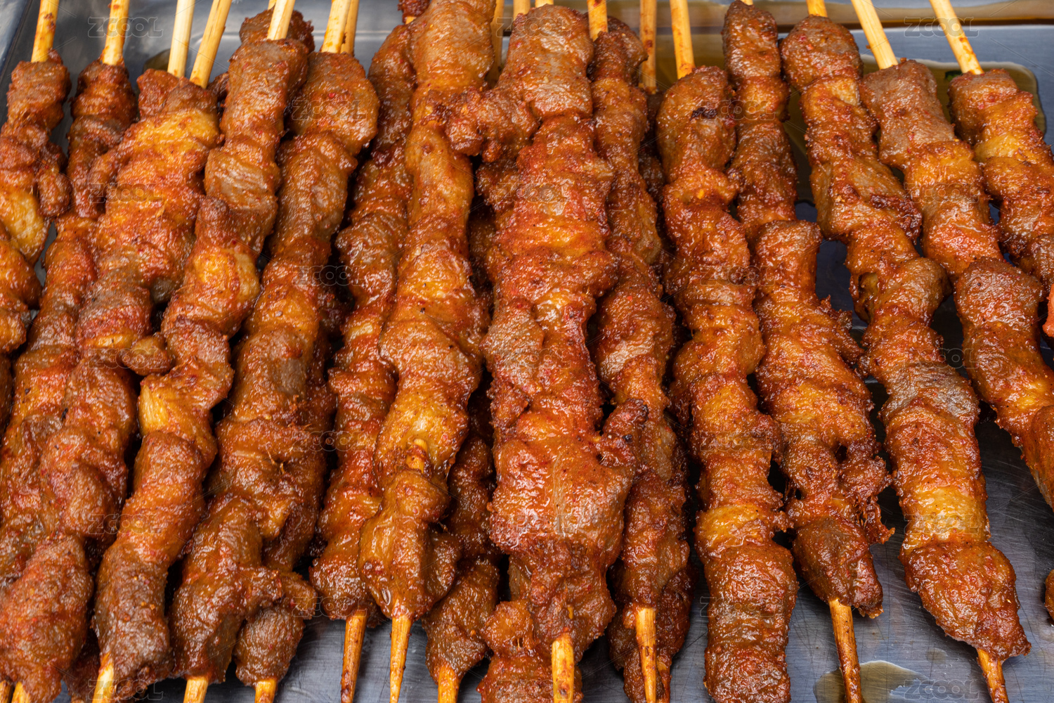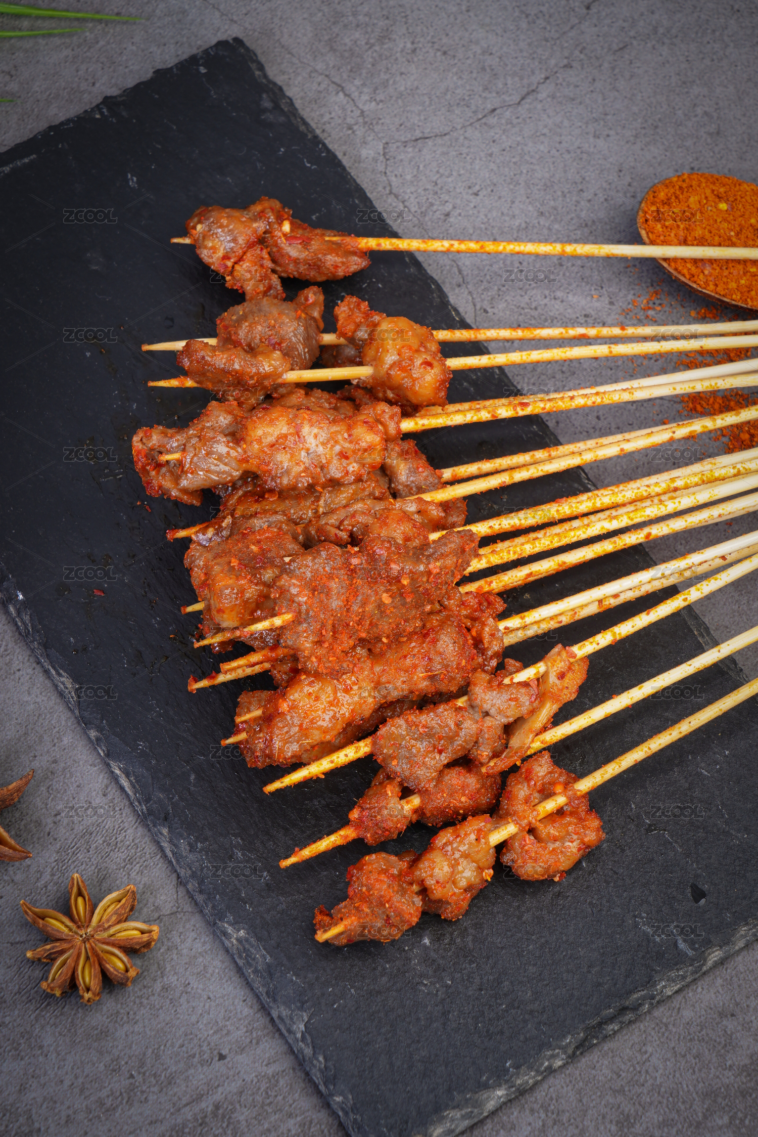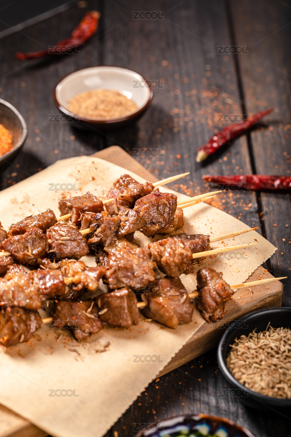 暗背景砧板水上多串放一起的烤肉羊肉串