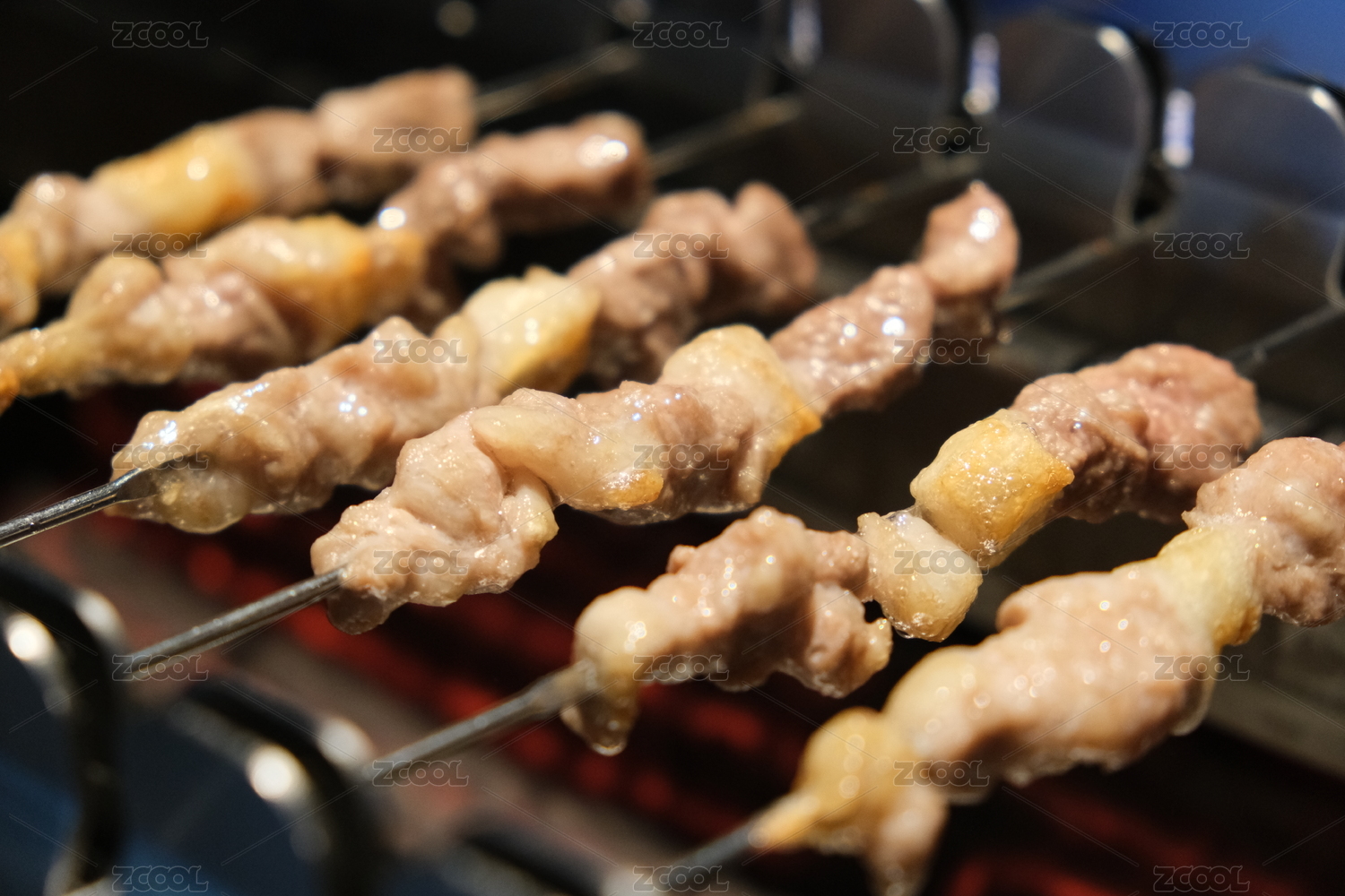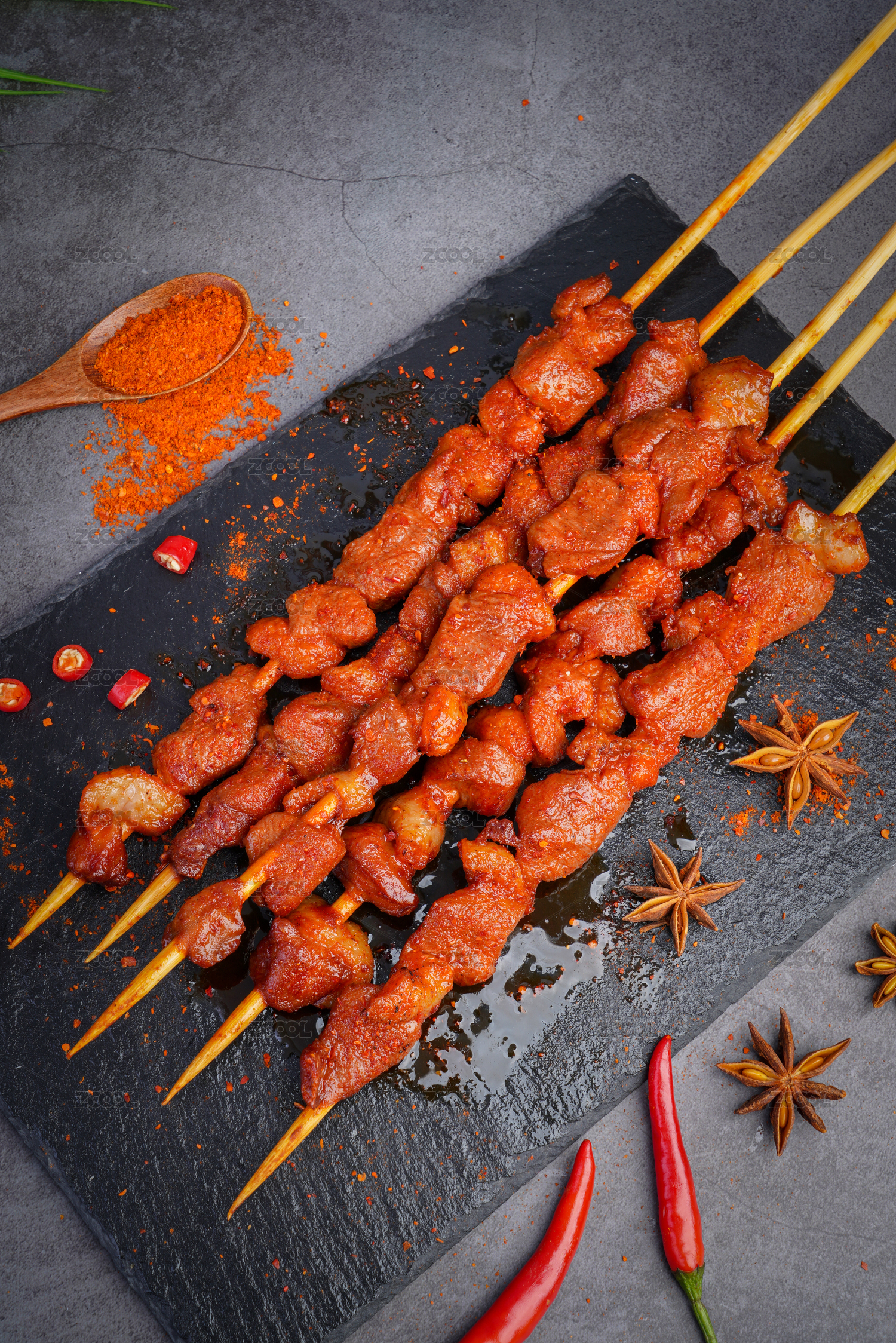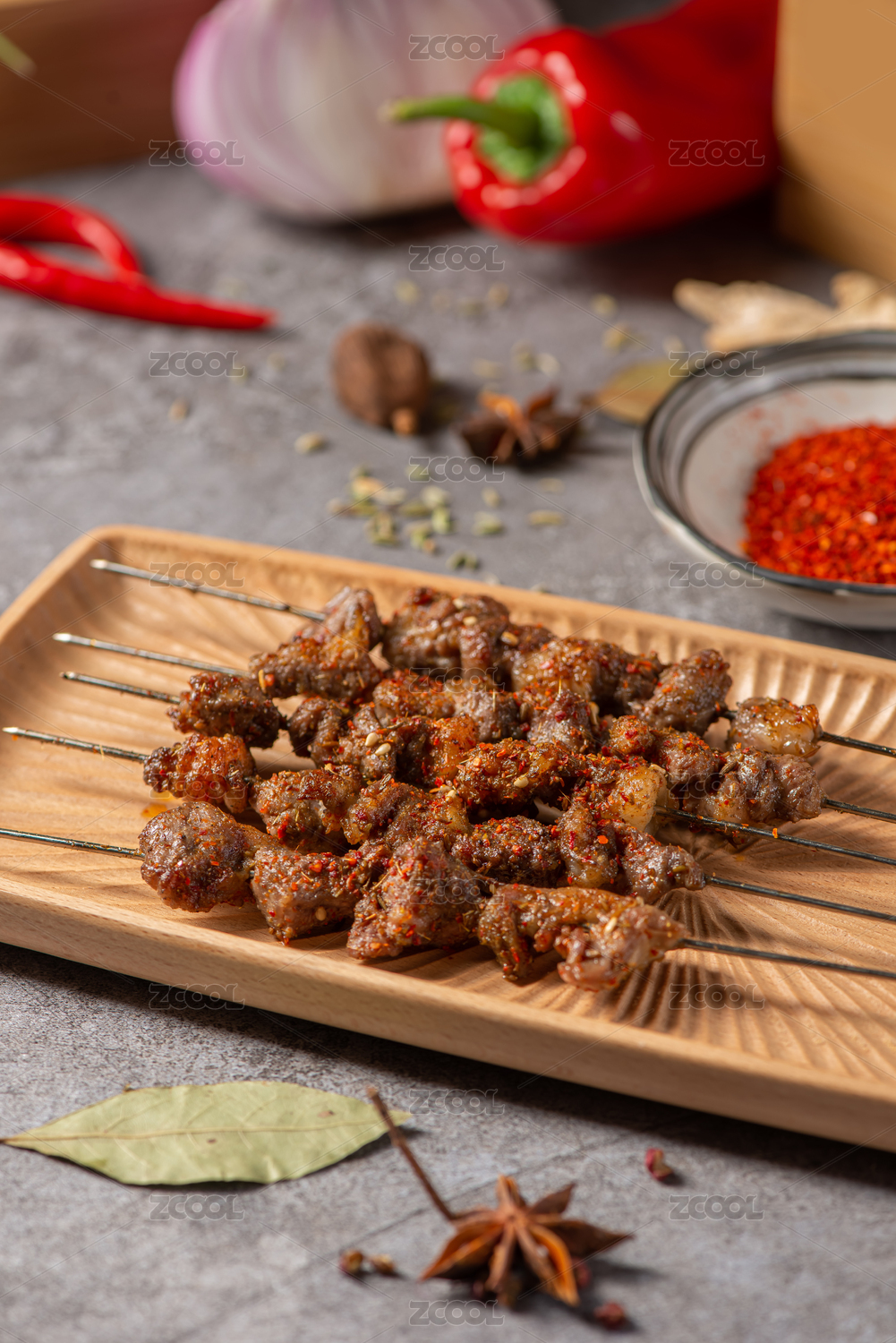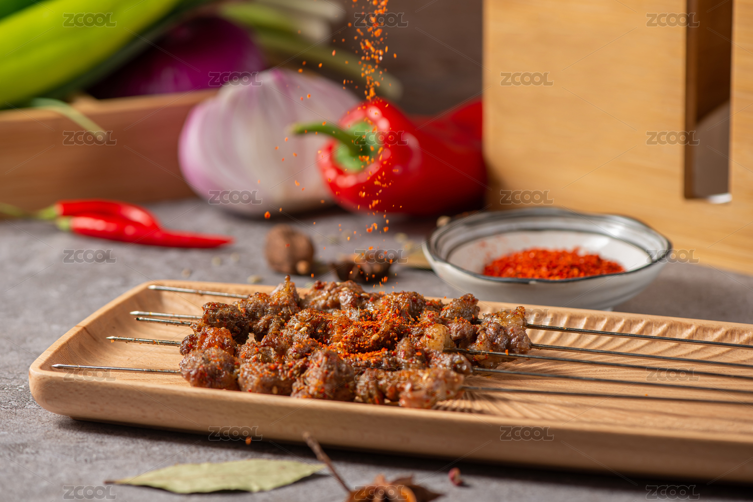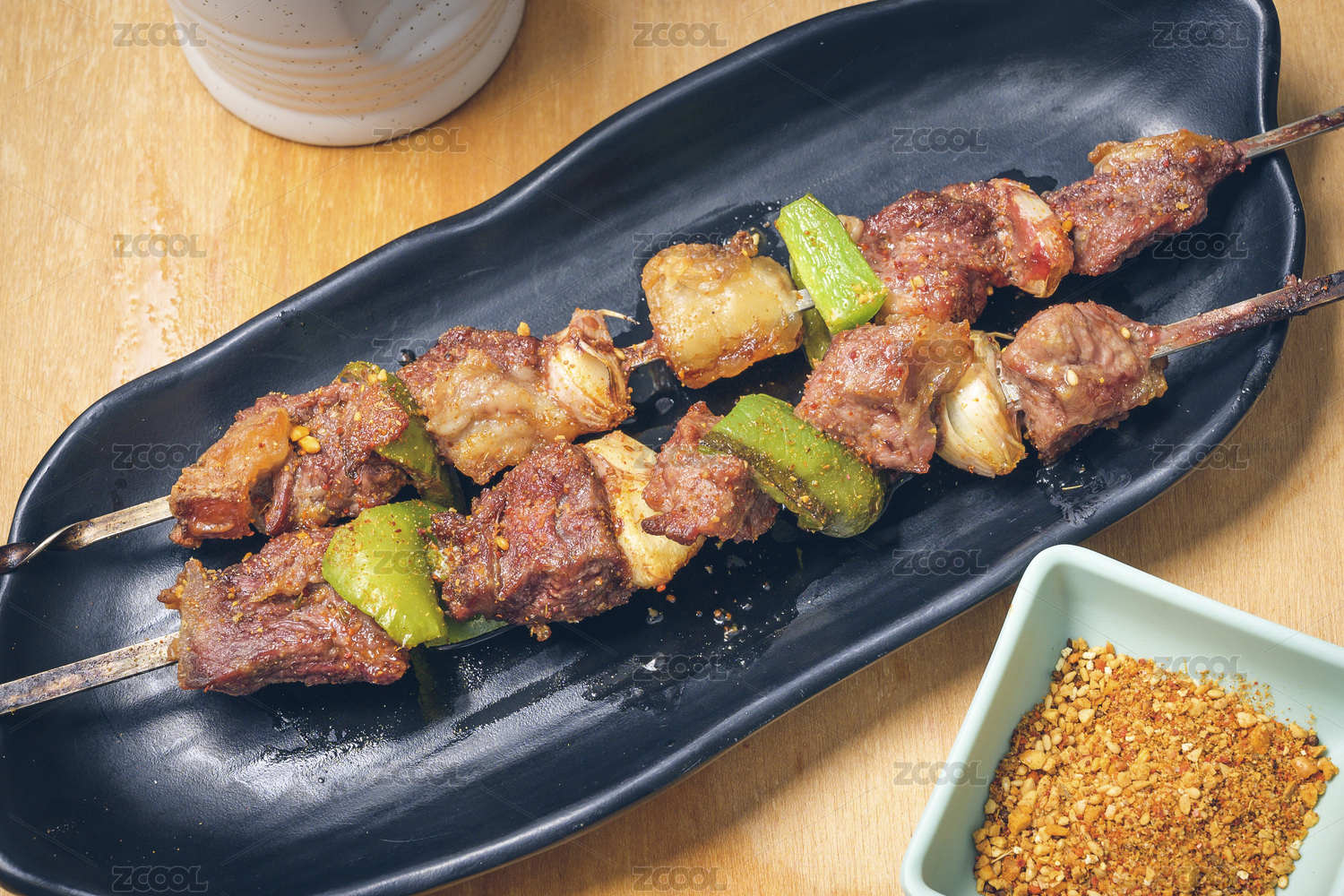 暗背景砧板水上多串放一起的烤肉羊肉串