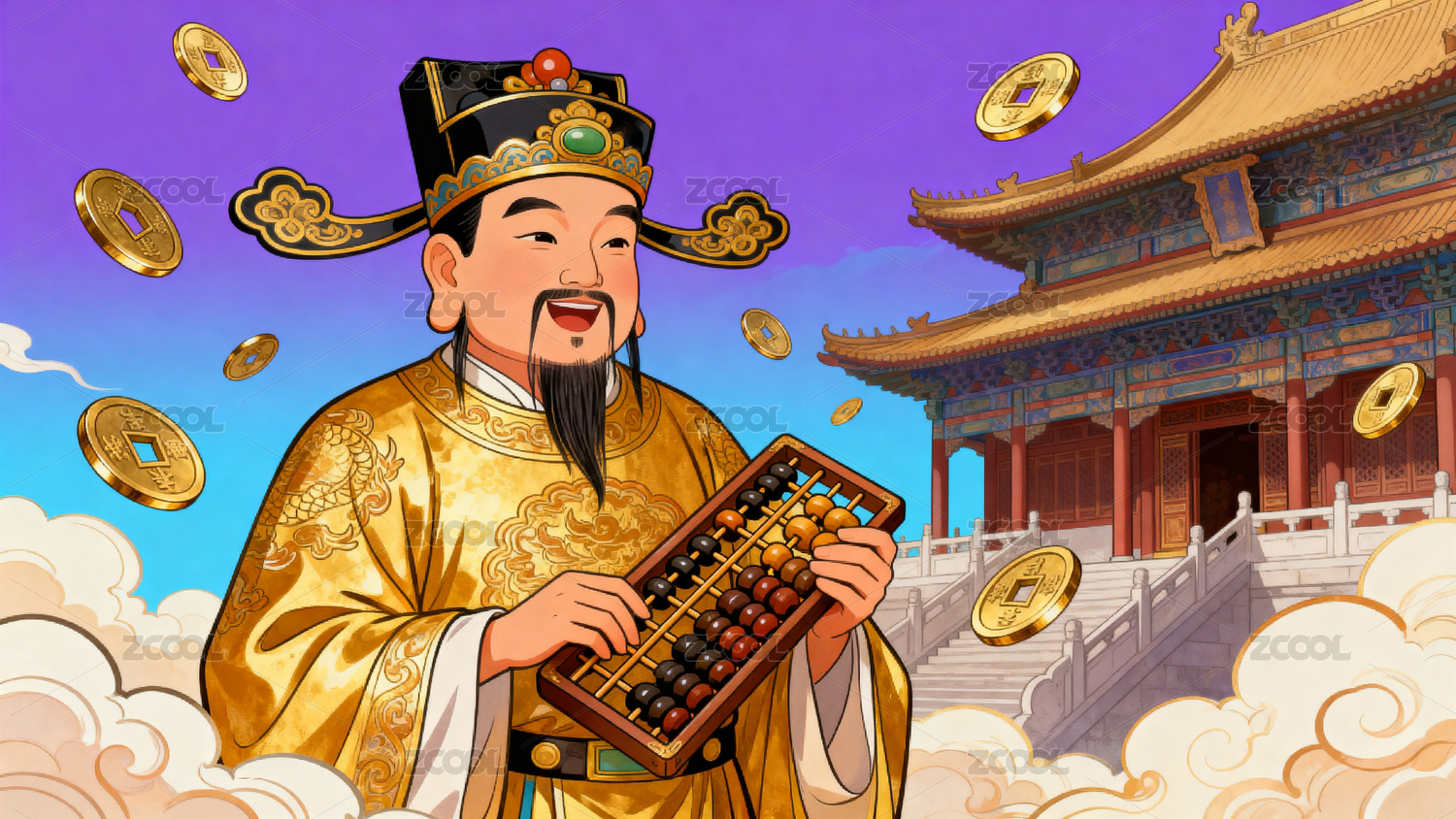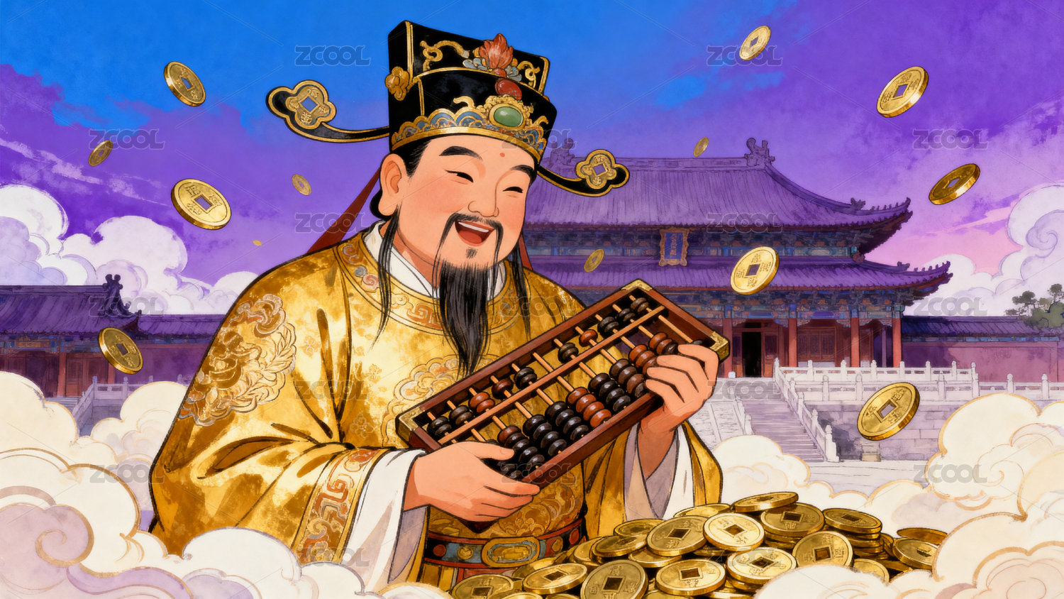 古代官員手持算盤(pán)金幣飛舞