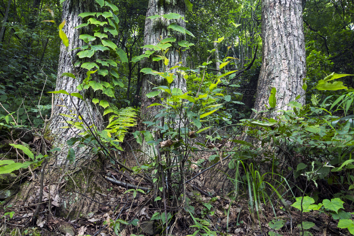 原始森林古道旁并排長著三顆筆直高大的古樟樹
