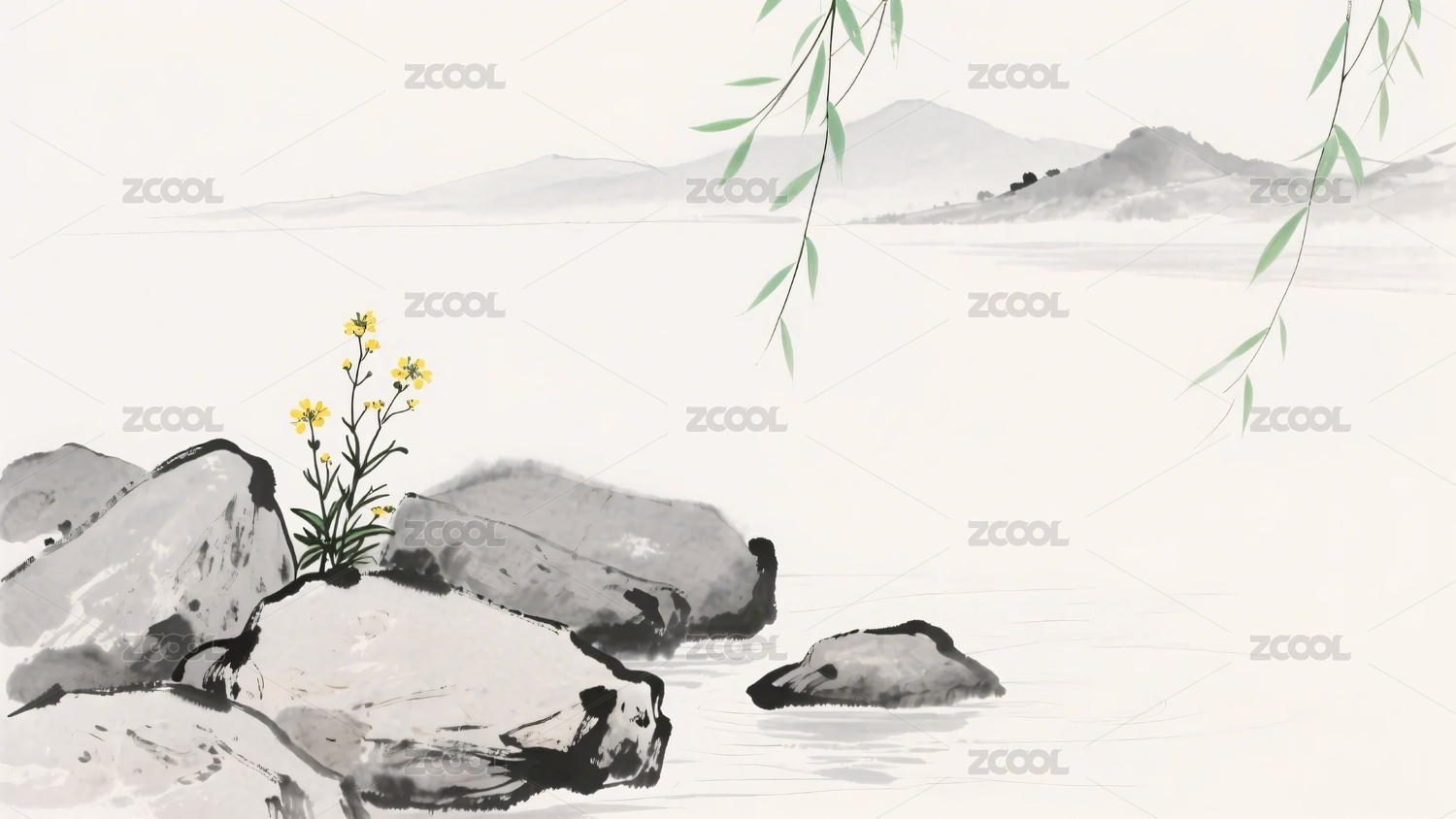 水墨山水間的小花與頑石