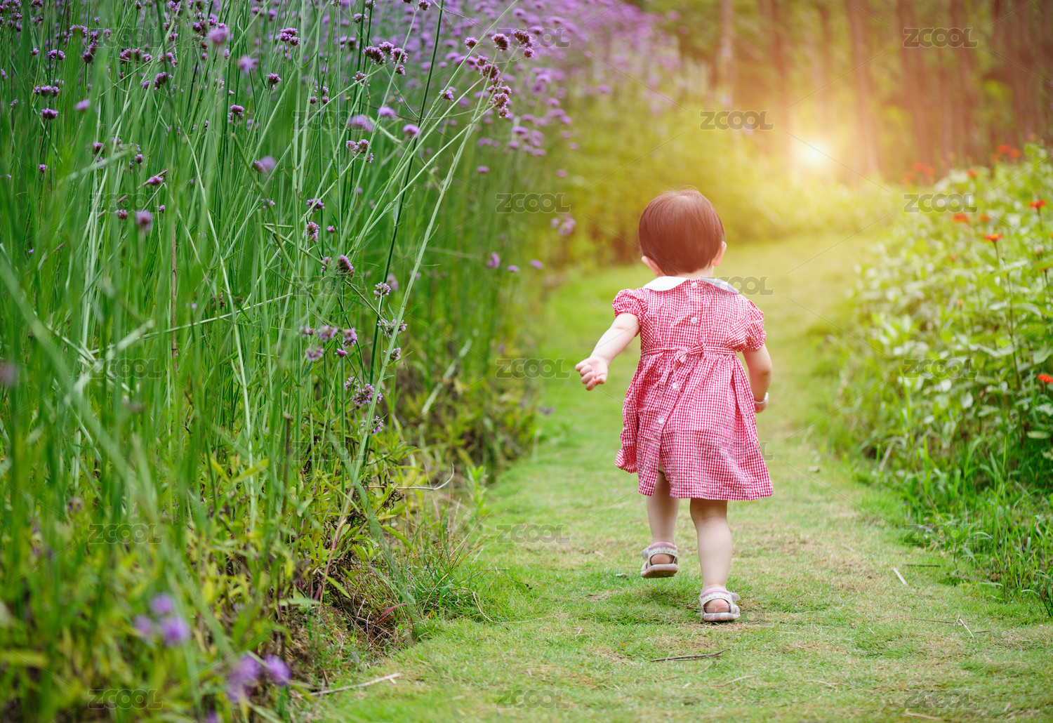 兒童節(jié)。小女孩在公園里跑步。后視圖