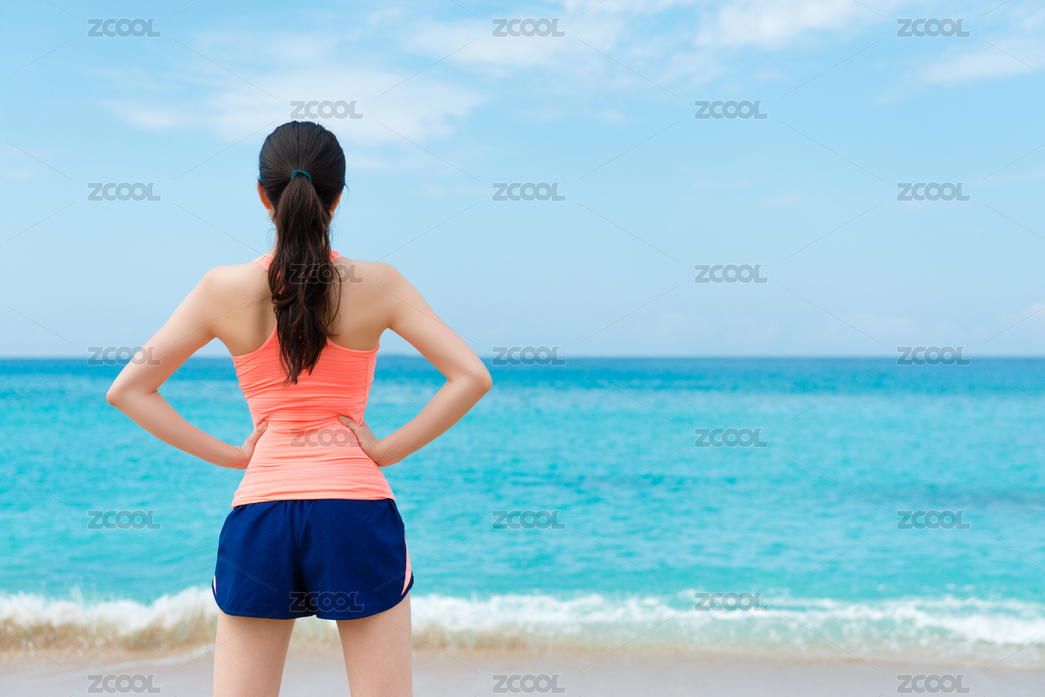 后視圖在海灘上放松和臉漂亮優(yōu)雅的女人亞軍完成訓(xùn)練站立到美麗的海景享受風(fēng)景的照片。