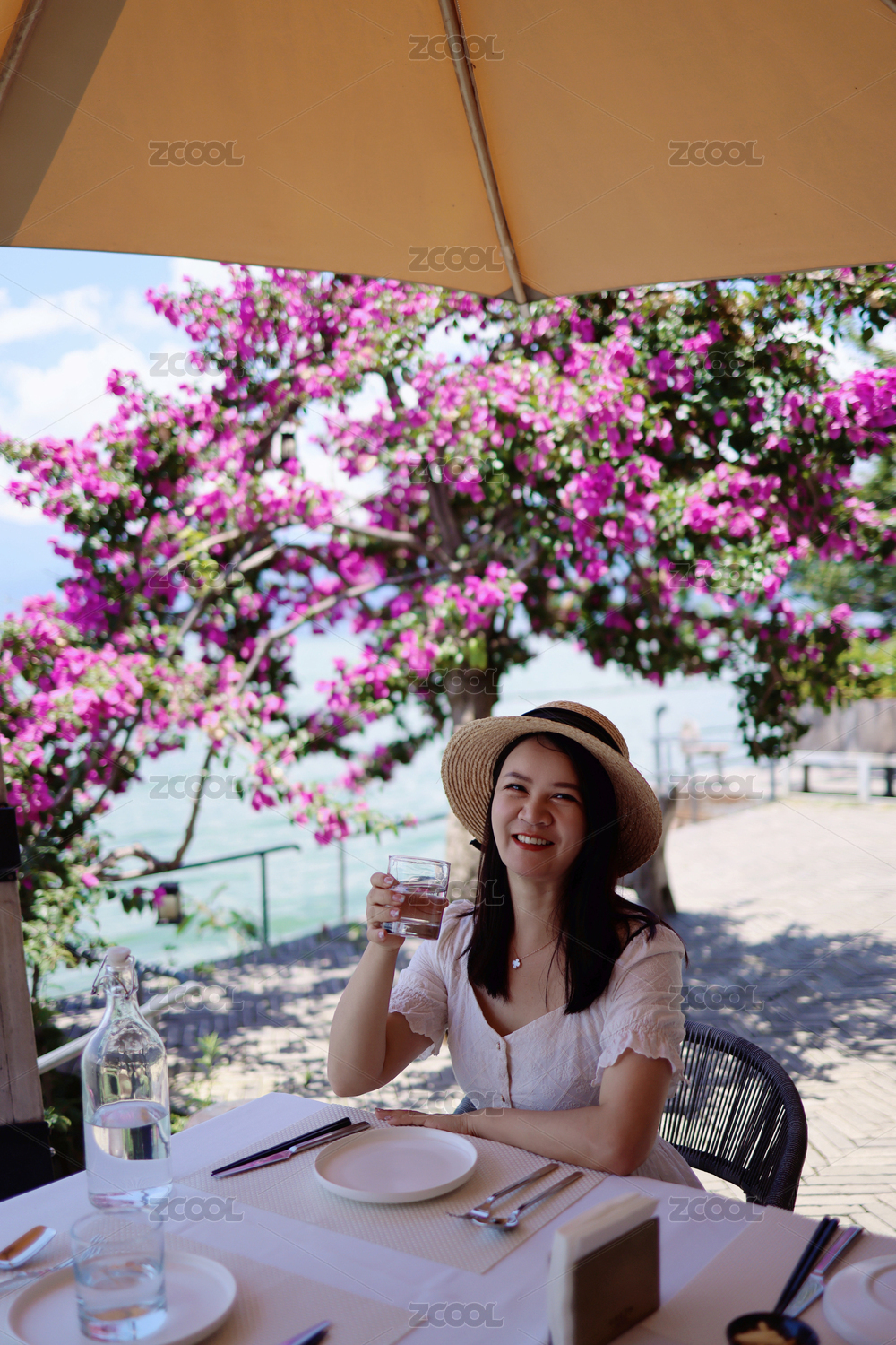 使用相機(jī)拍攝的照片與當(dāng)?shù)毓?yīng)商的時(shí)候,她正在船上參觀泰國丹能沙都水上市場的年輕女孩旅客的后視圖。