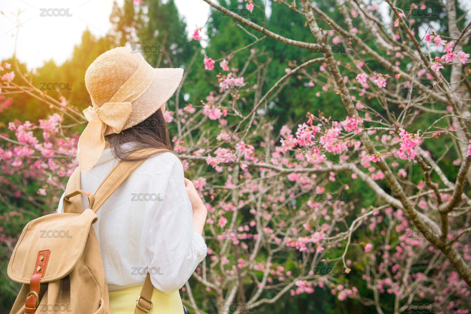 后視圖游客出游女學(xué)生看櫻花的花朵在日本旅游著名的櫻花樹園享受春假。