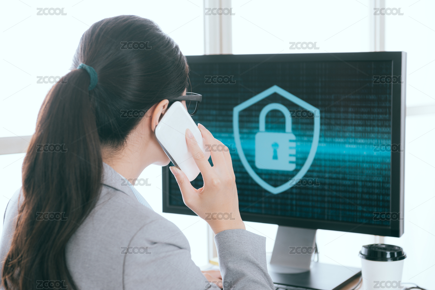 使用移動(dòng)手機(jī)客戶交談解釋網(wǎng)上信息安全的重要性黑色長發(fā)的女商人后視圖照片。