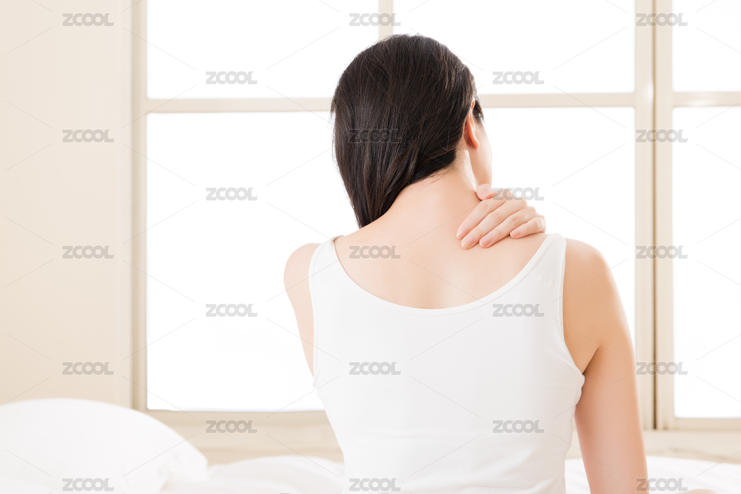 亞洲美麗的痛苦肩頸酸痛疲憊的坐在了床上。臥室背景。后視圖