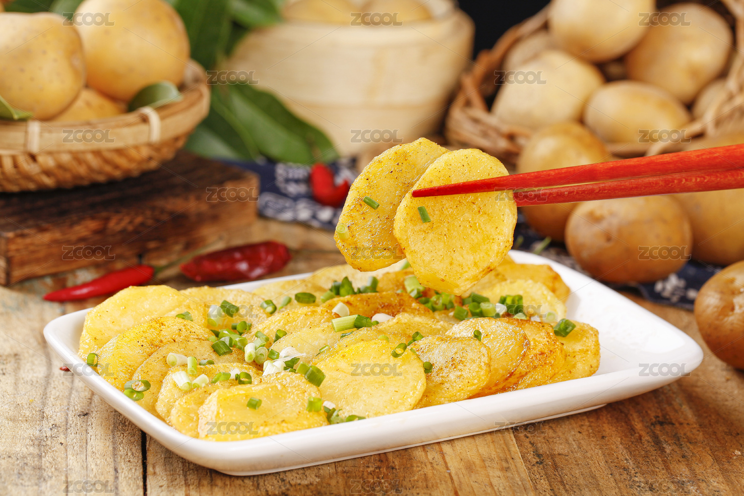 木底上放著一盤椒鹽土豆片和筷子夾著土豆片