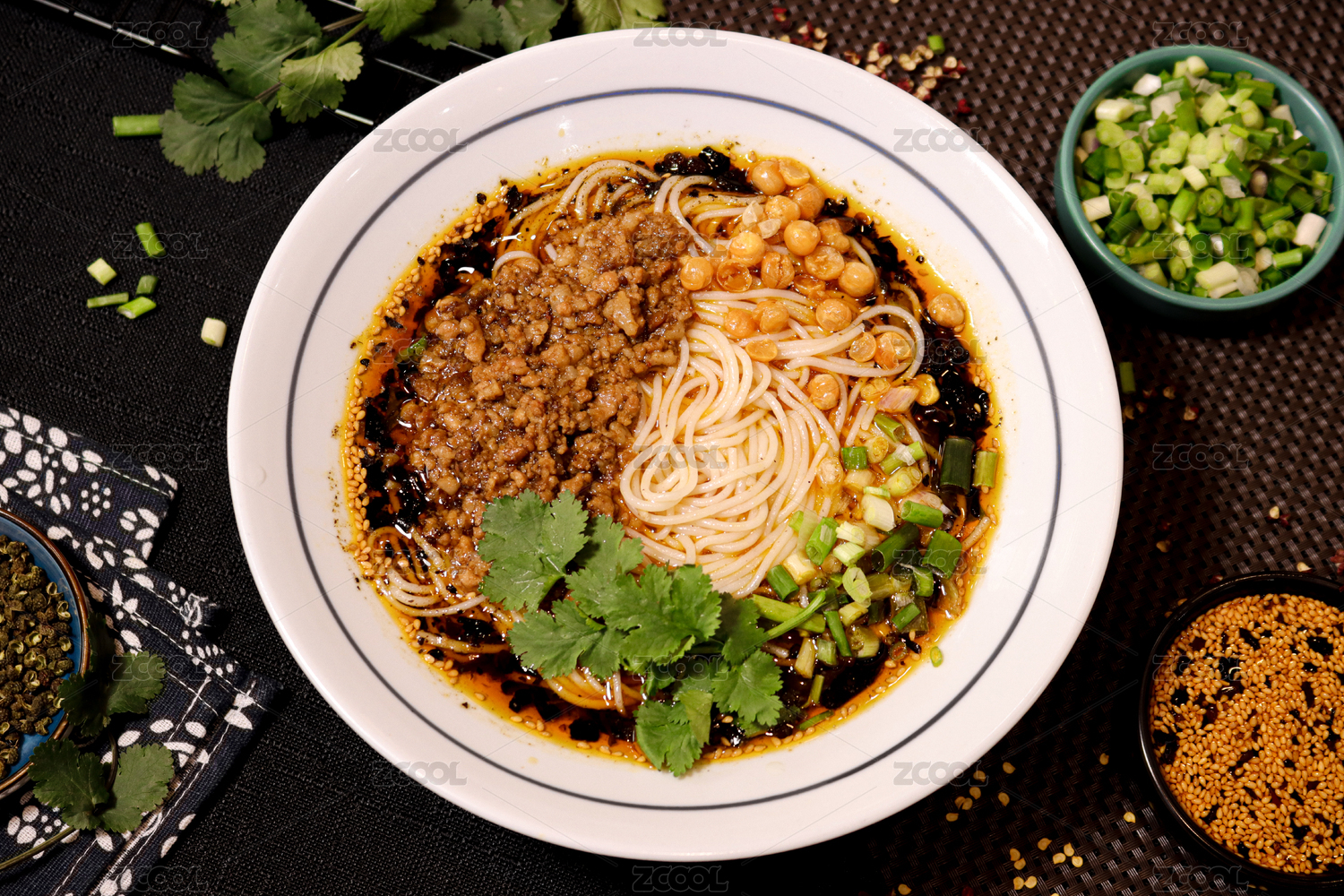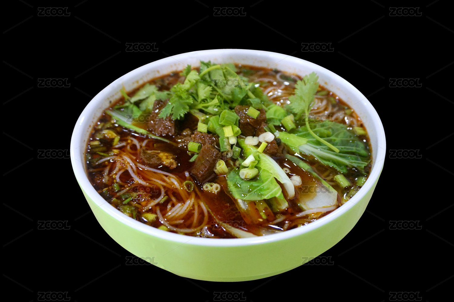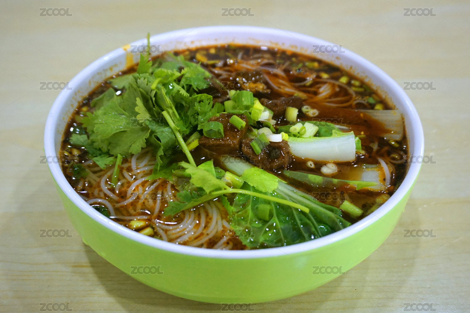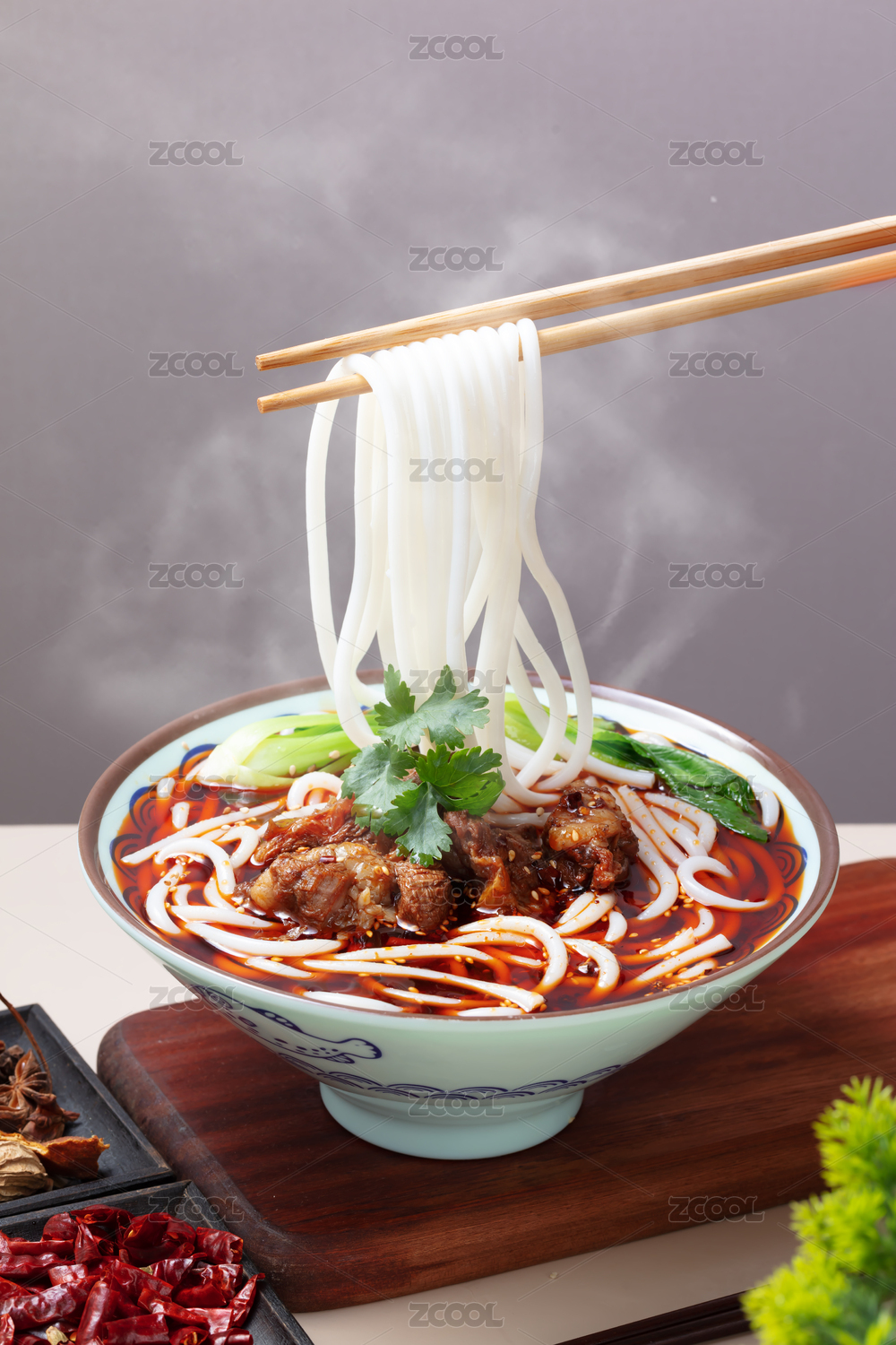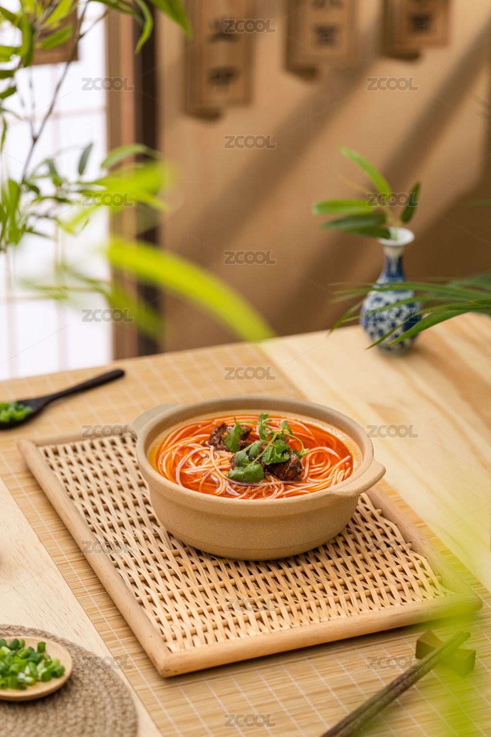 青花瓷碗里的油辣子紅湯羊肉米粉米線