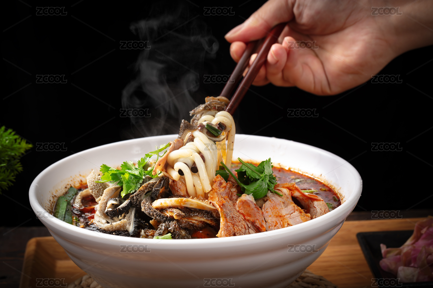 托盤(pán)上筷子夾著里紅湯雙拼羊雜羊肉粉米粉