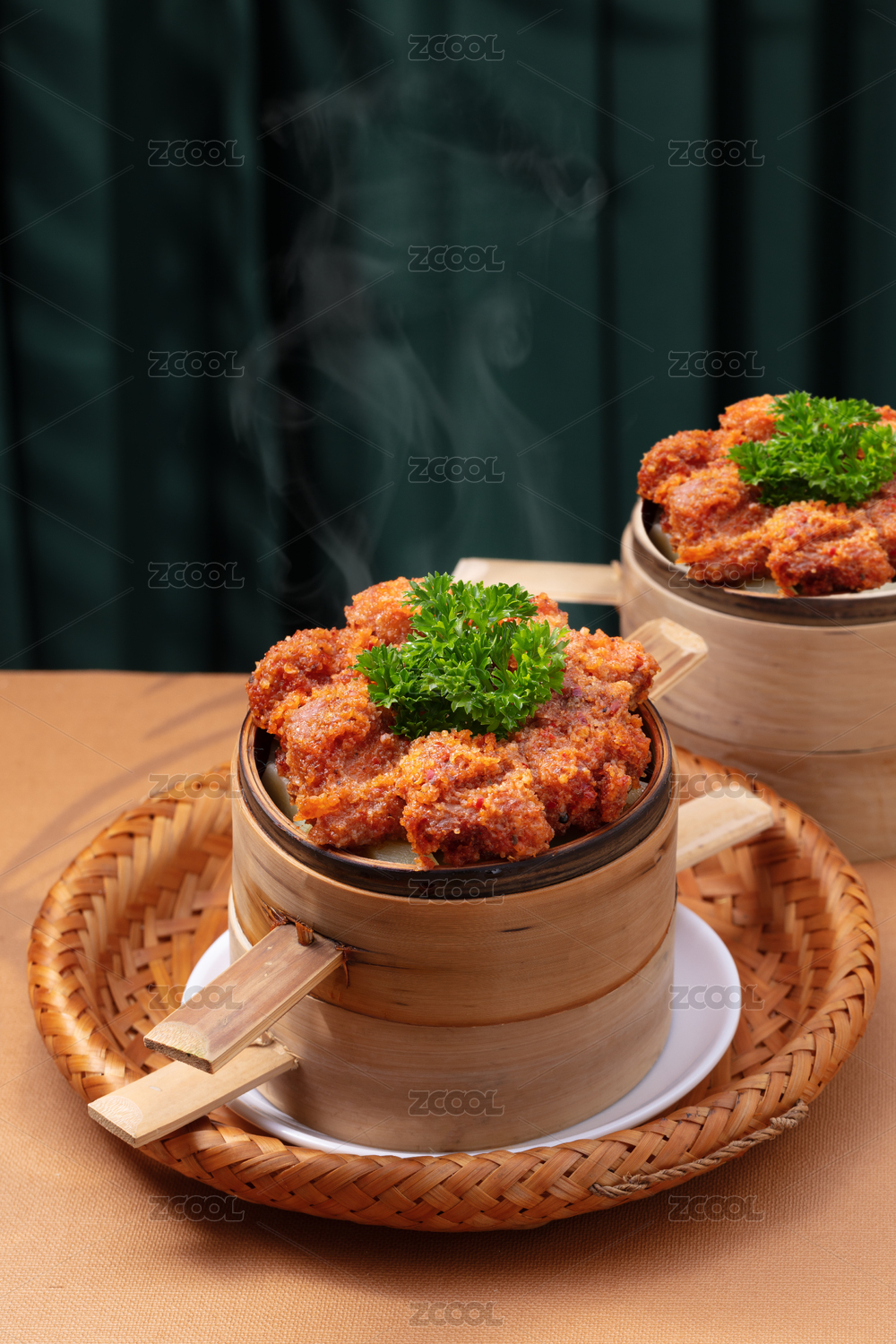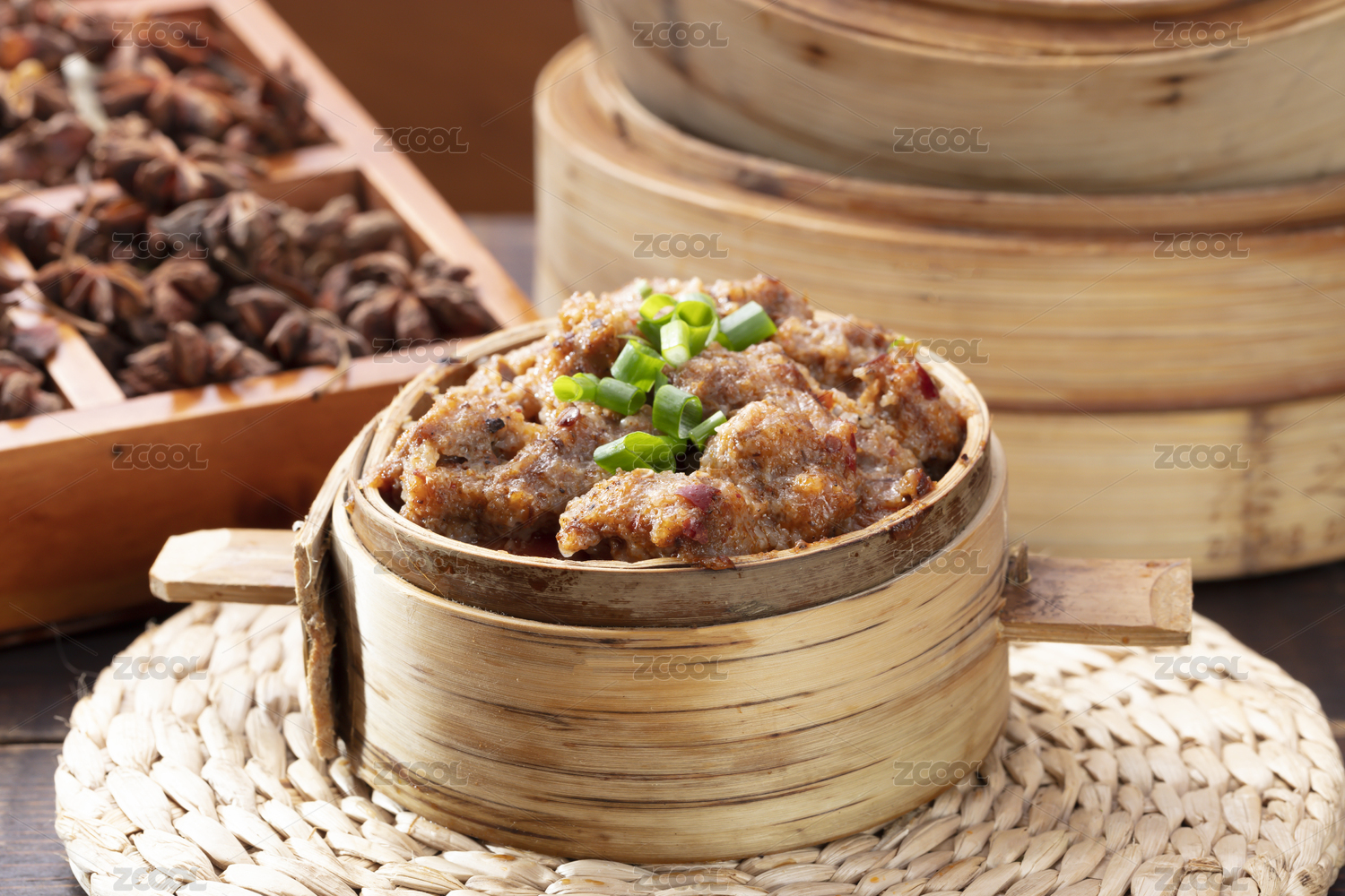 竹制小蒸籠里的粉蒸羊排骨粉蒸肉羊肉格格