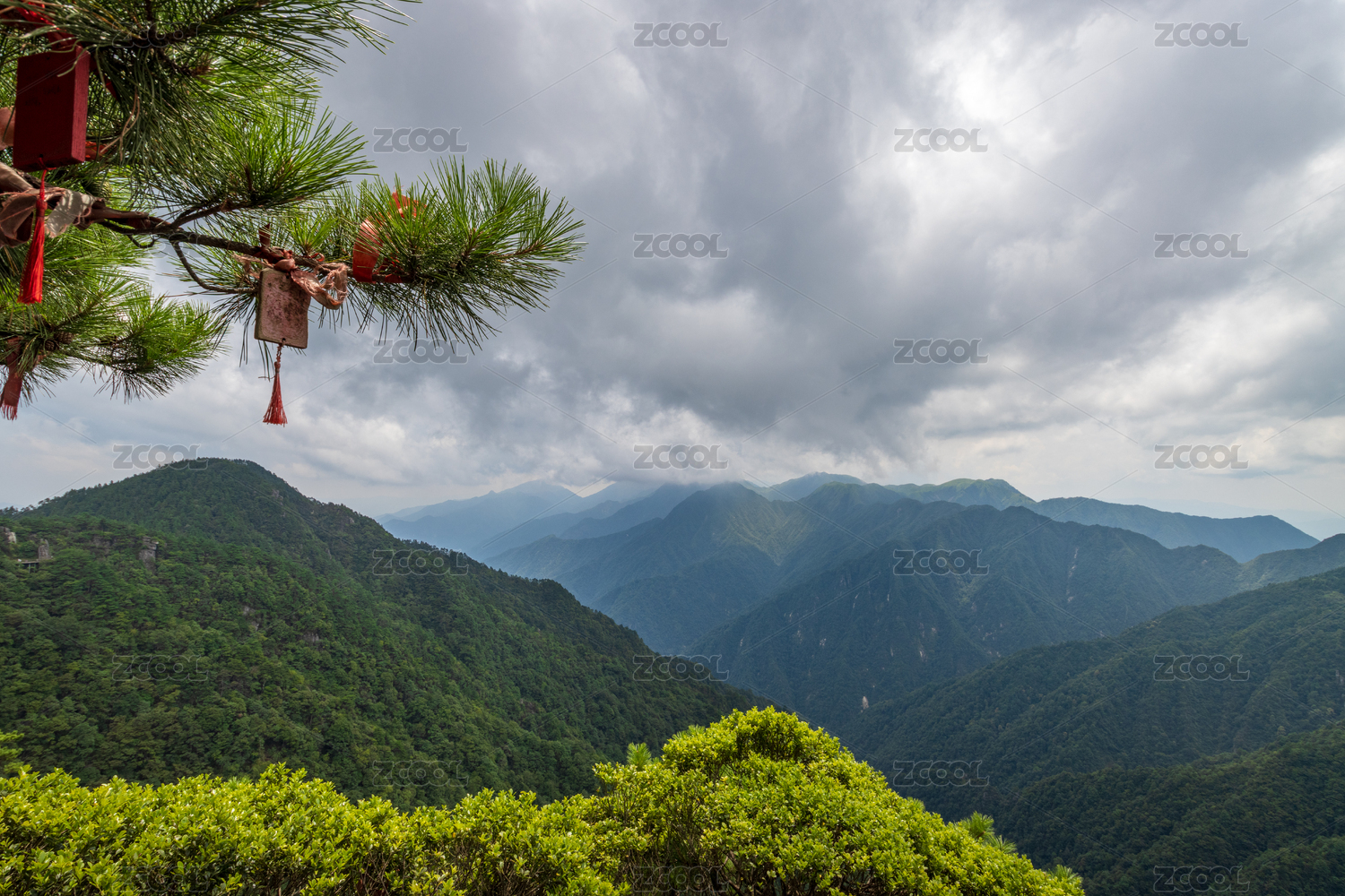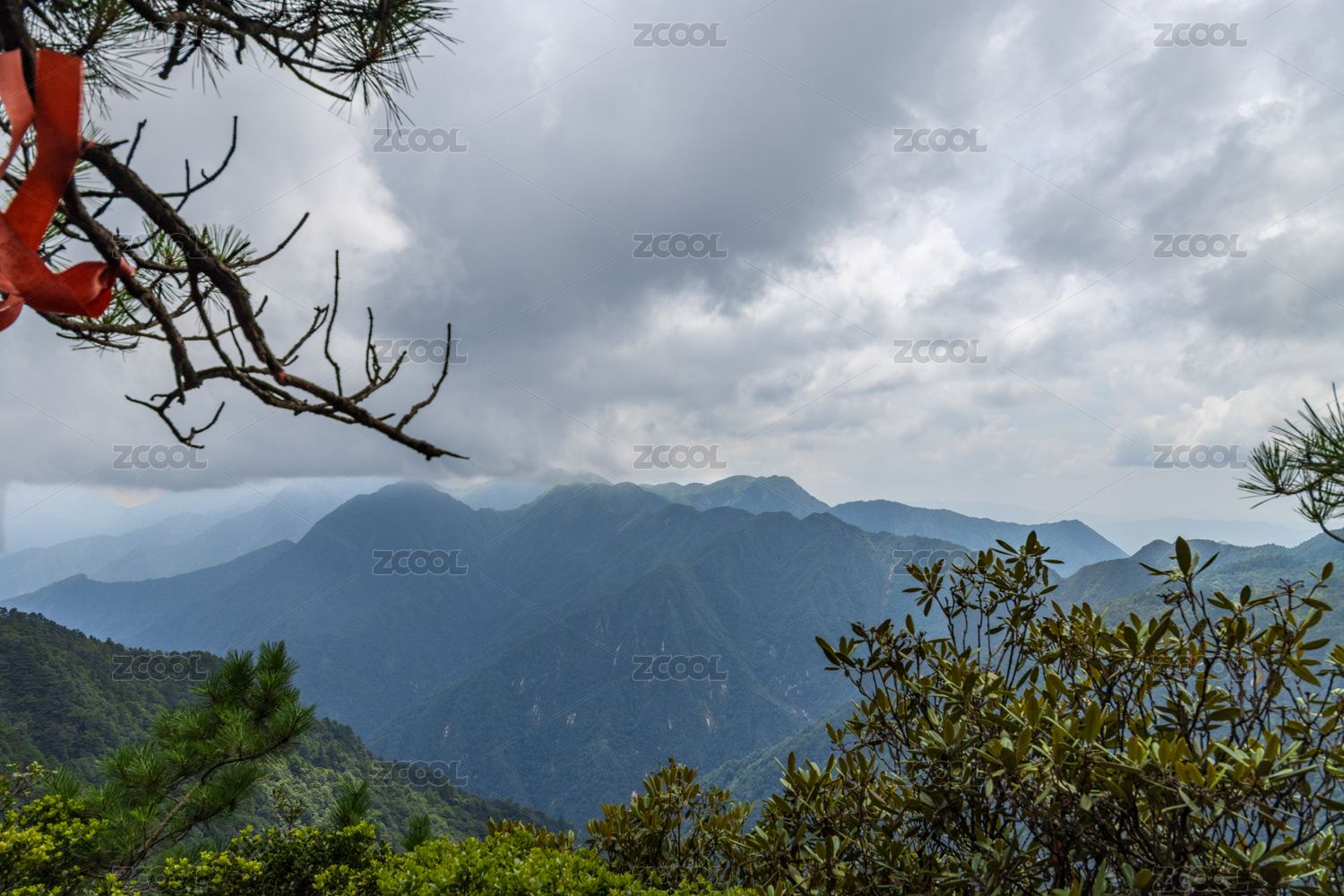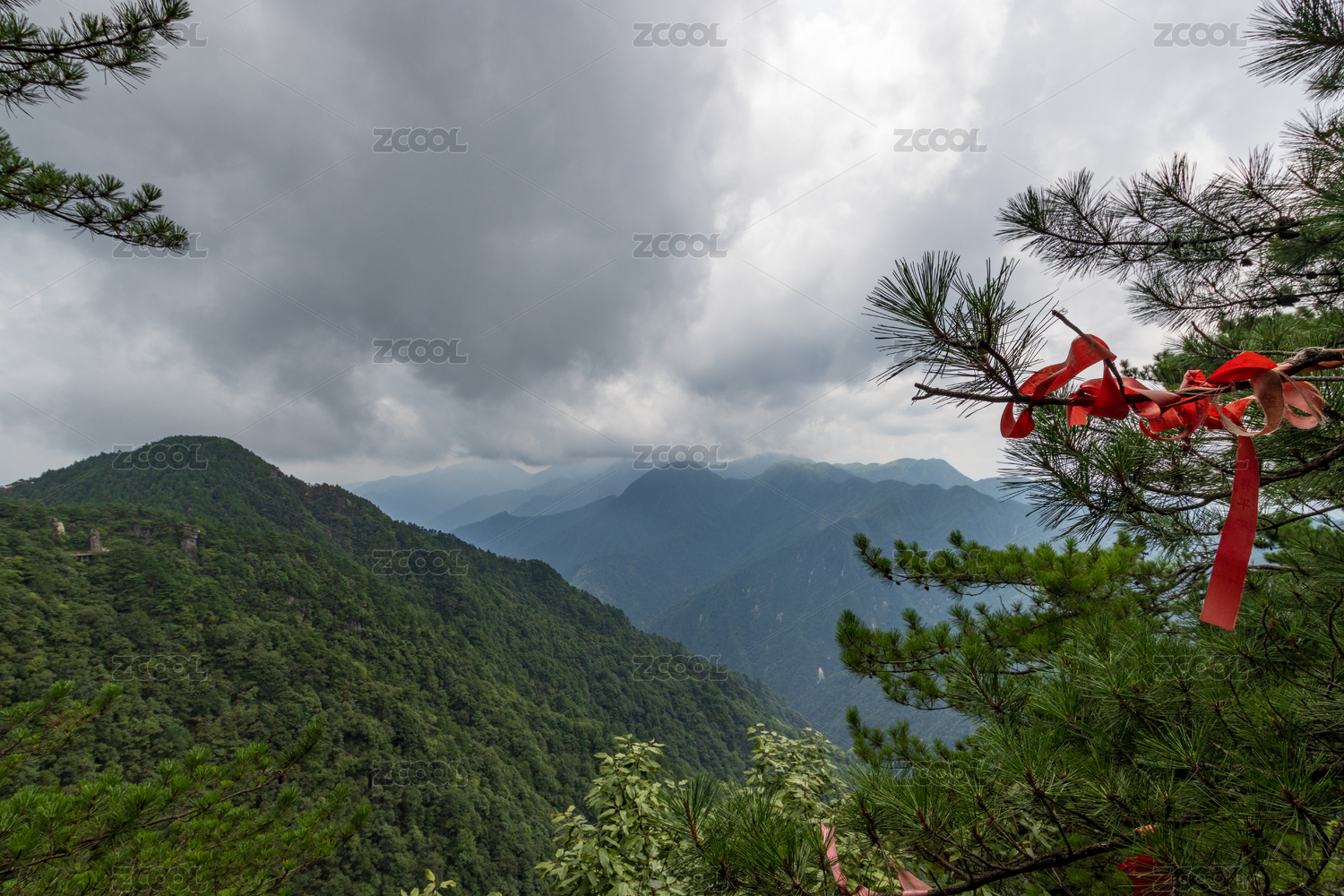 江西武功山羊獅慕景區(qū)山間紅綢與翠綠山巒