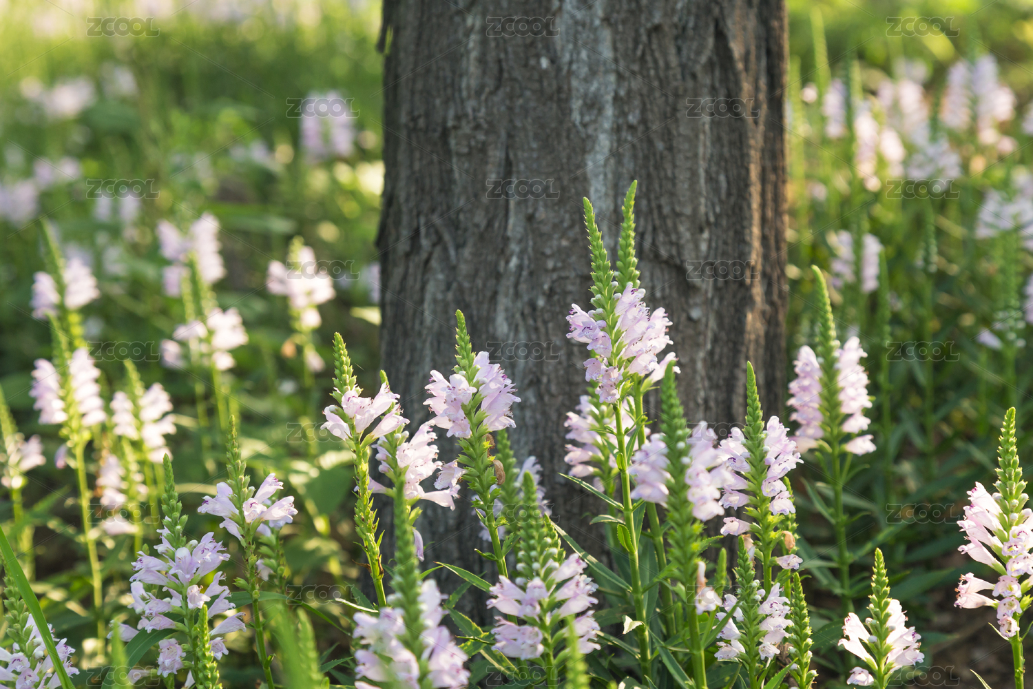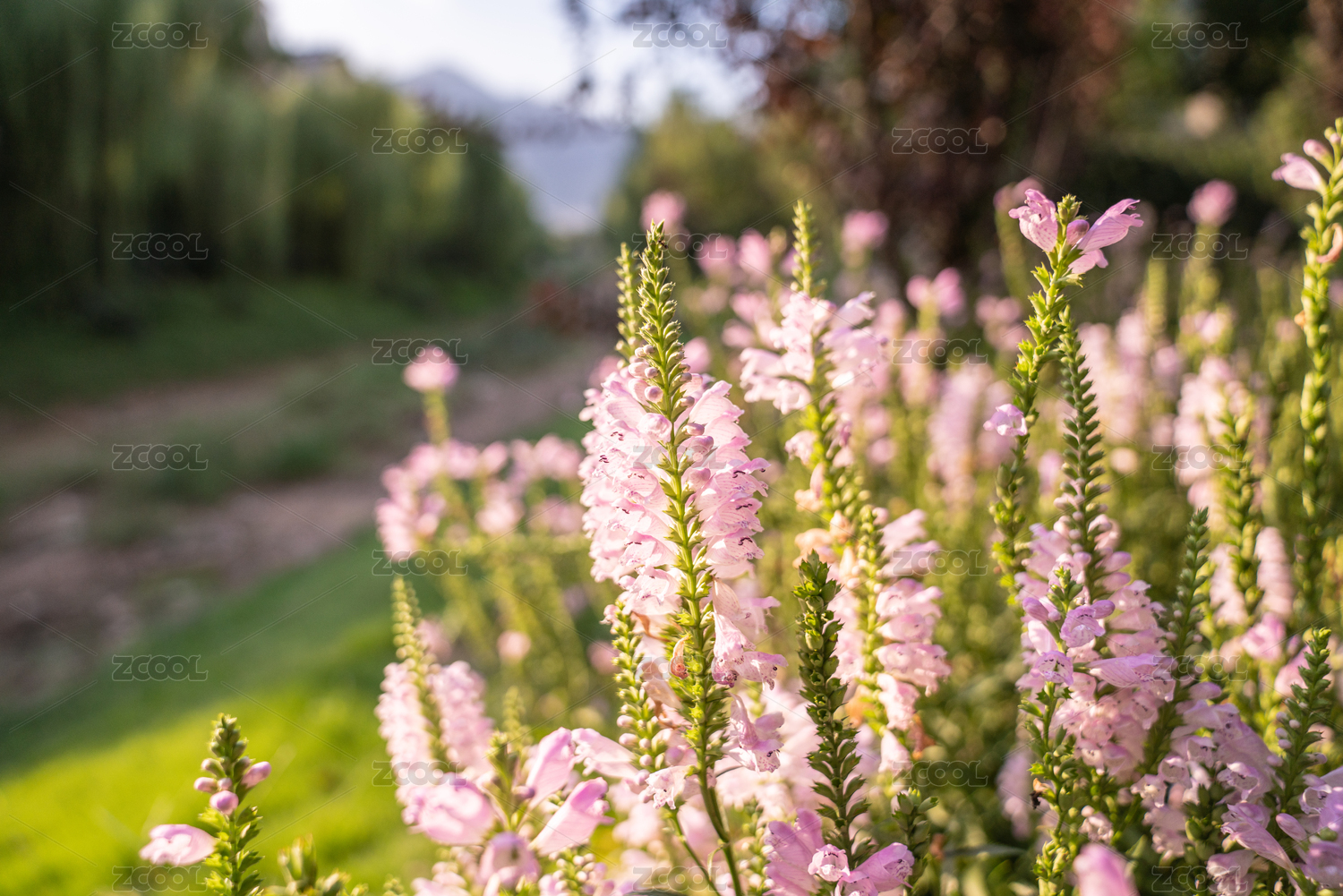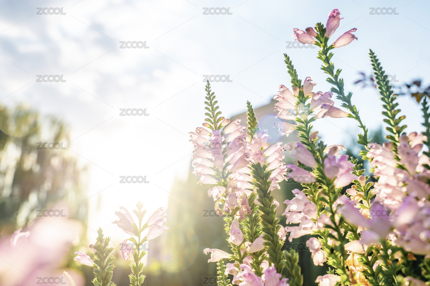 秋季戶外一只在假龍頭草花叢覓食的蜂鳥鷹蛾