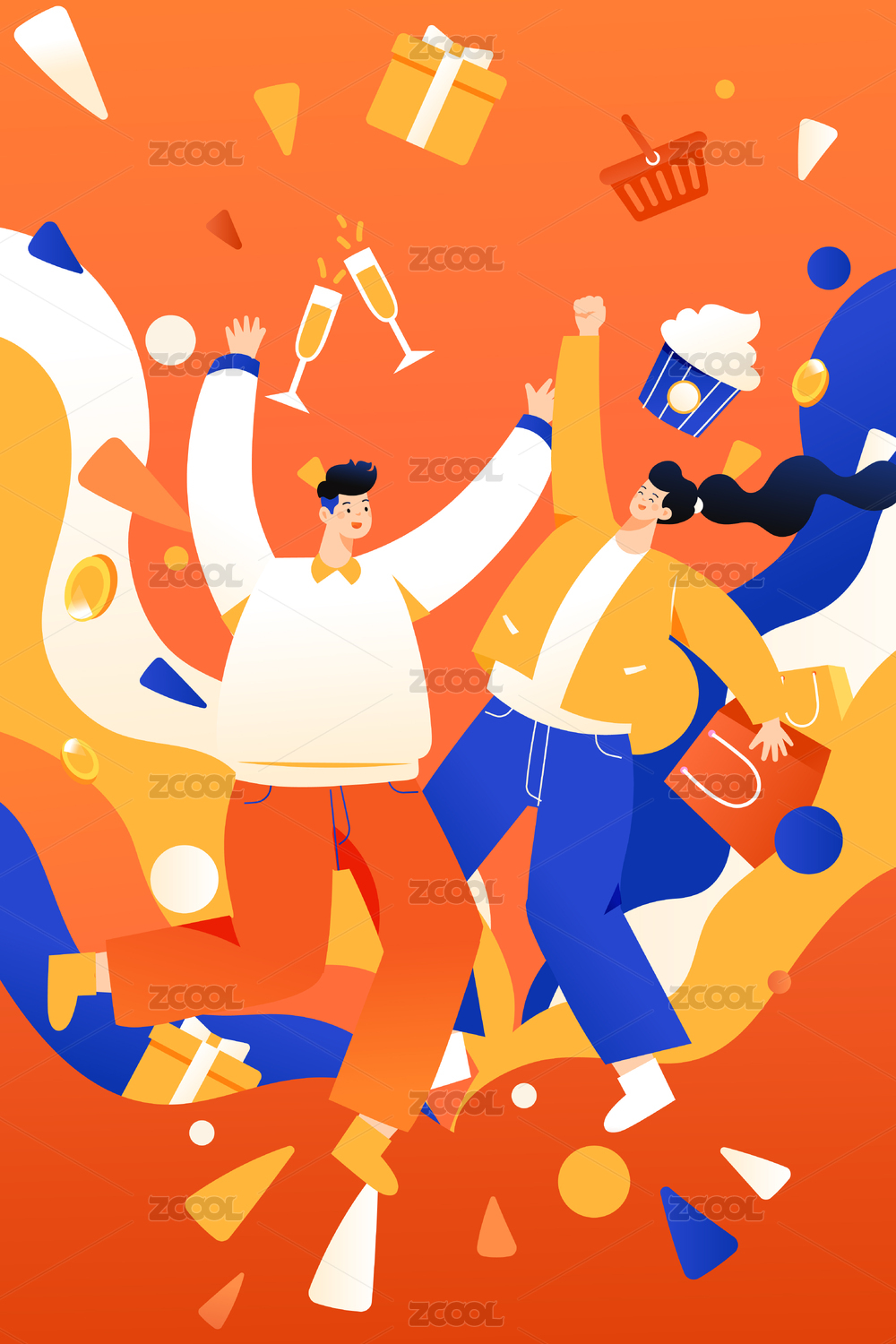 卡通手繪金幣推廣活動(dòng)卡通男女跳躍素材插畫(huà)