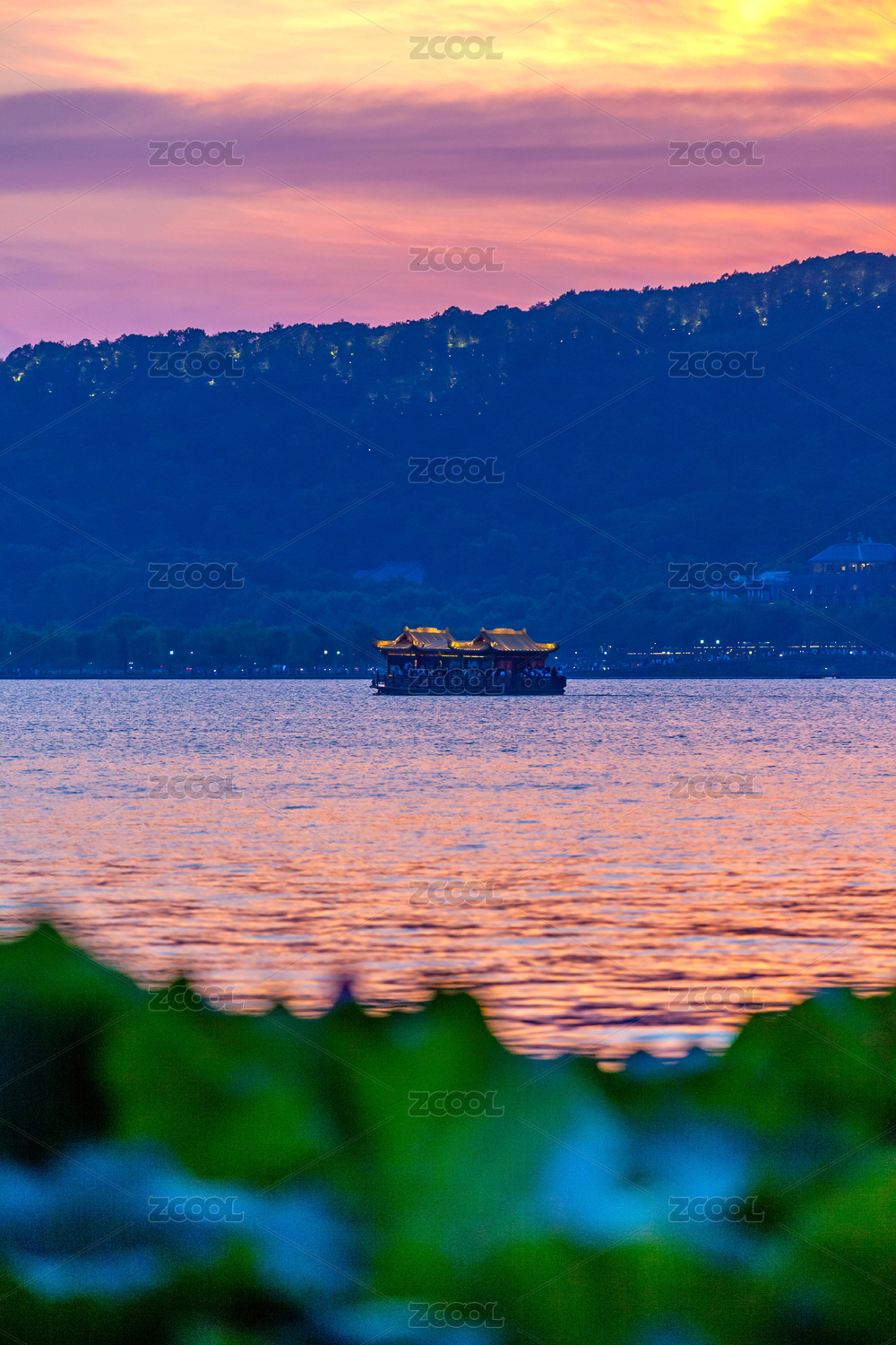 浙江杭州西湖晚霞夜景