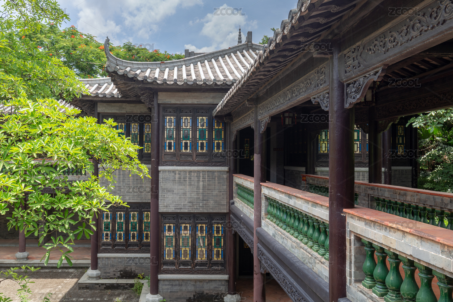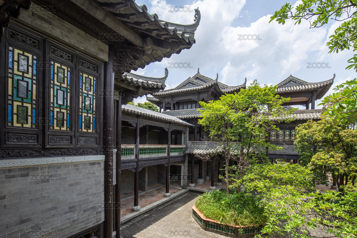 隱藏在樹林中的嶺南建筑景觀圖