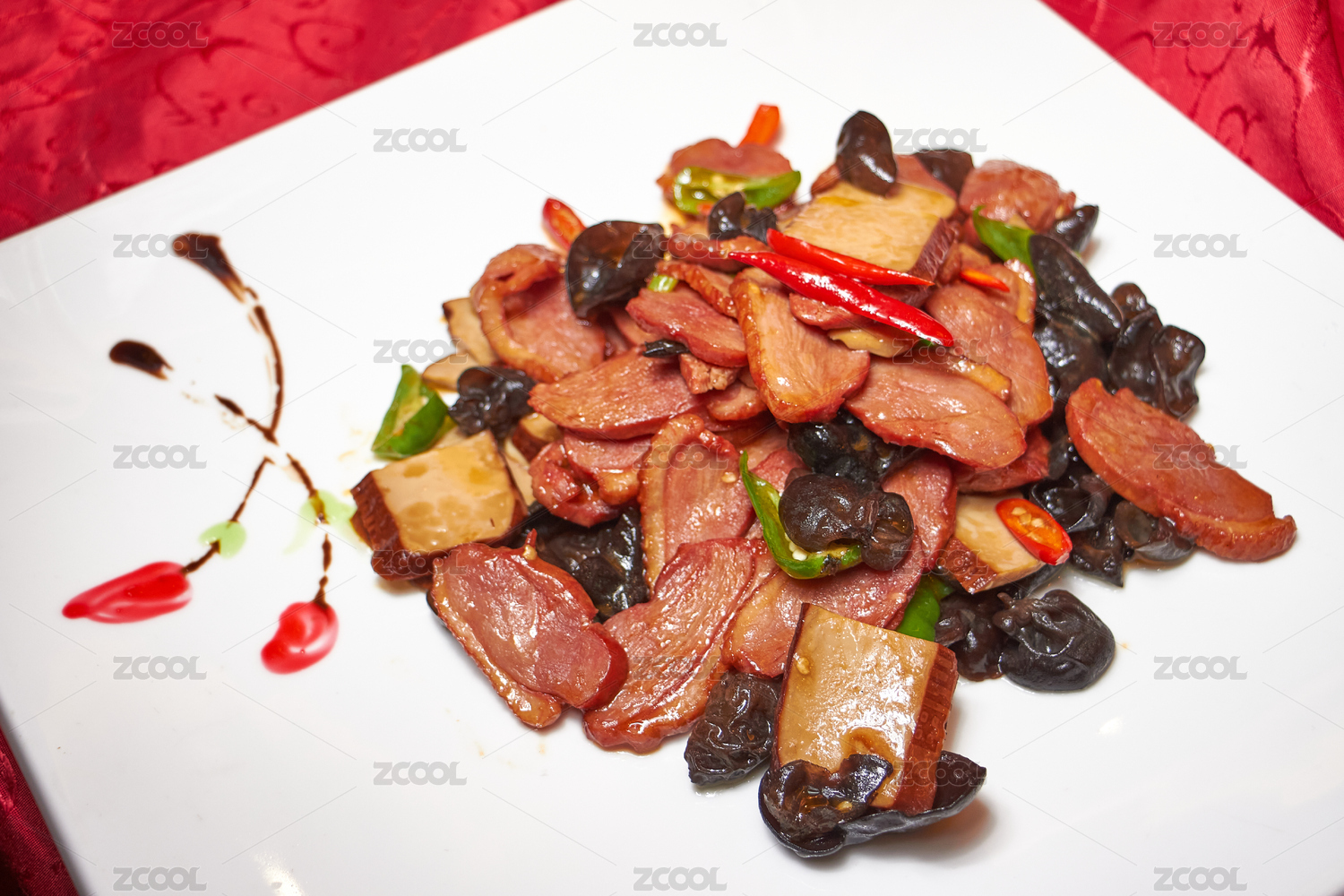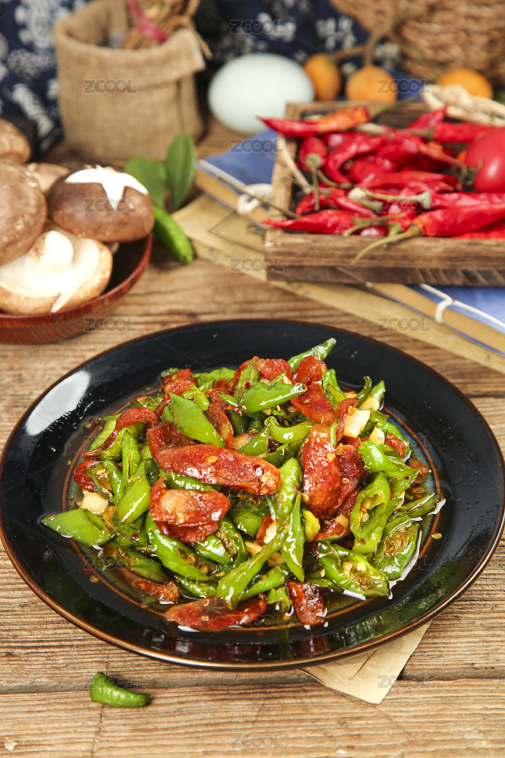 木底上放著一盤(pán)尖椒炒臘腸