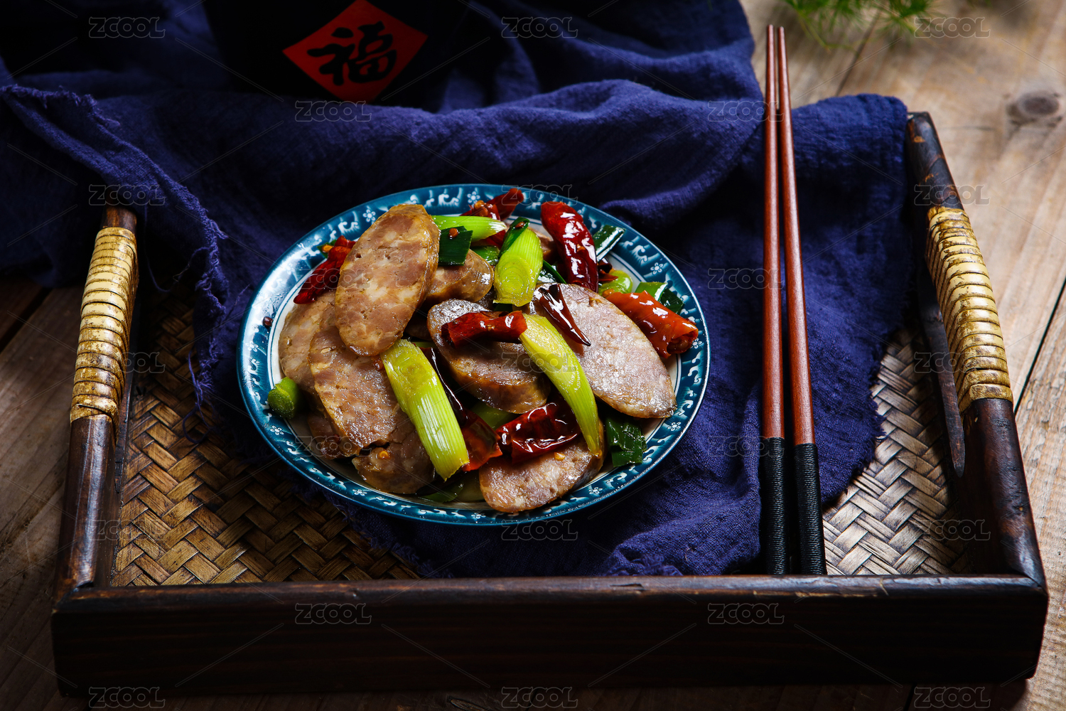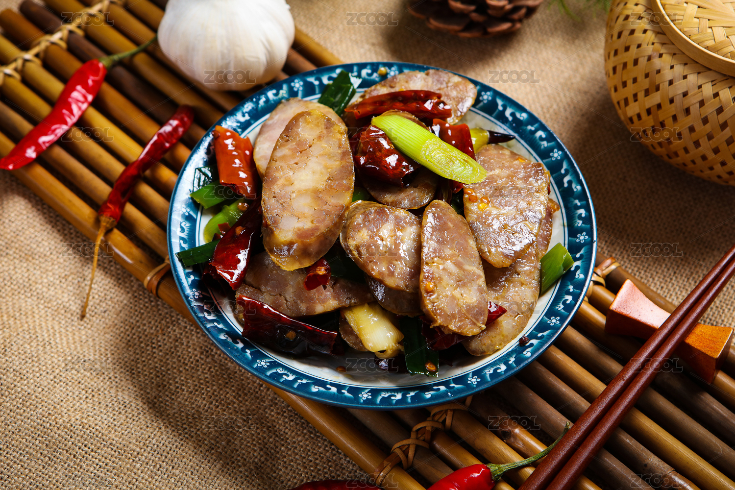 木底上放著一盤(pán)辣椒炒香腸和筷子上夾著香腸