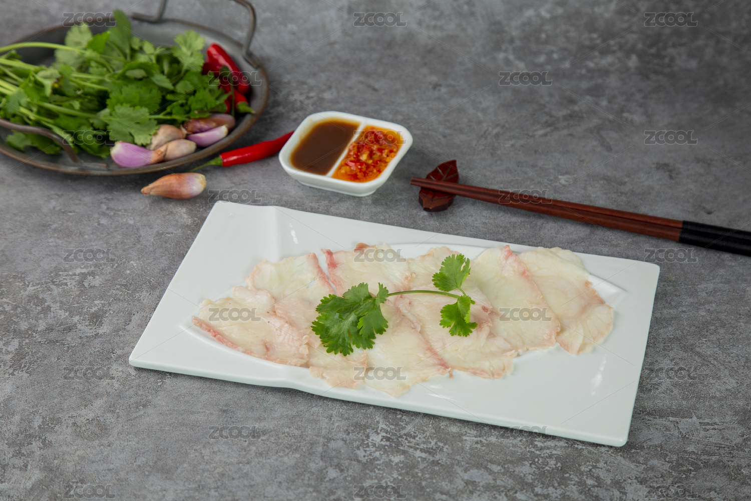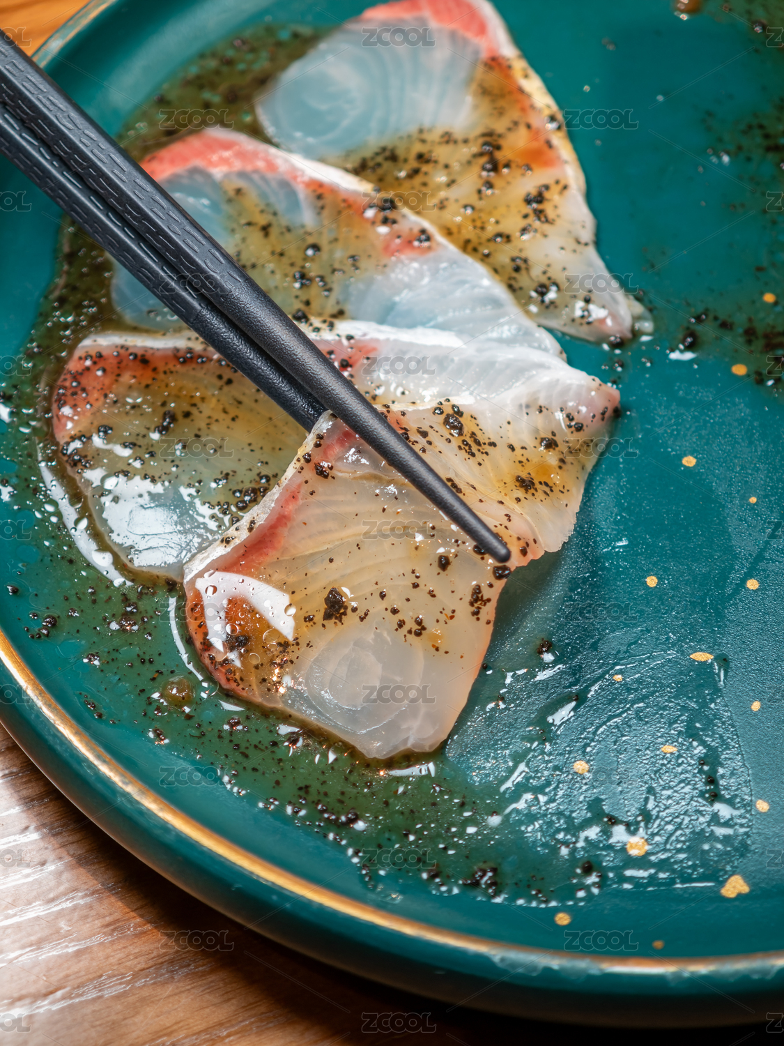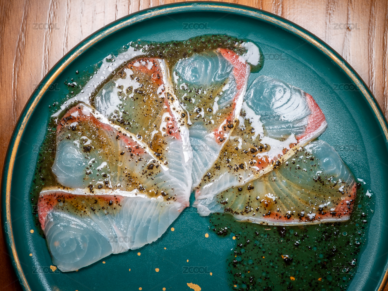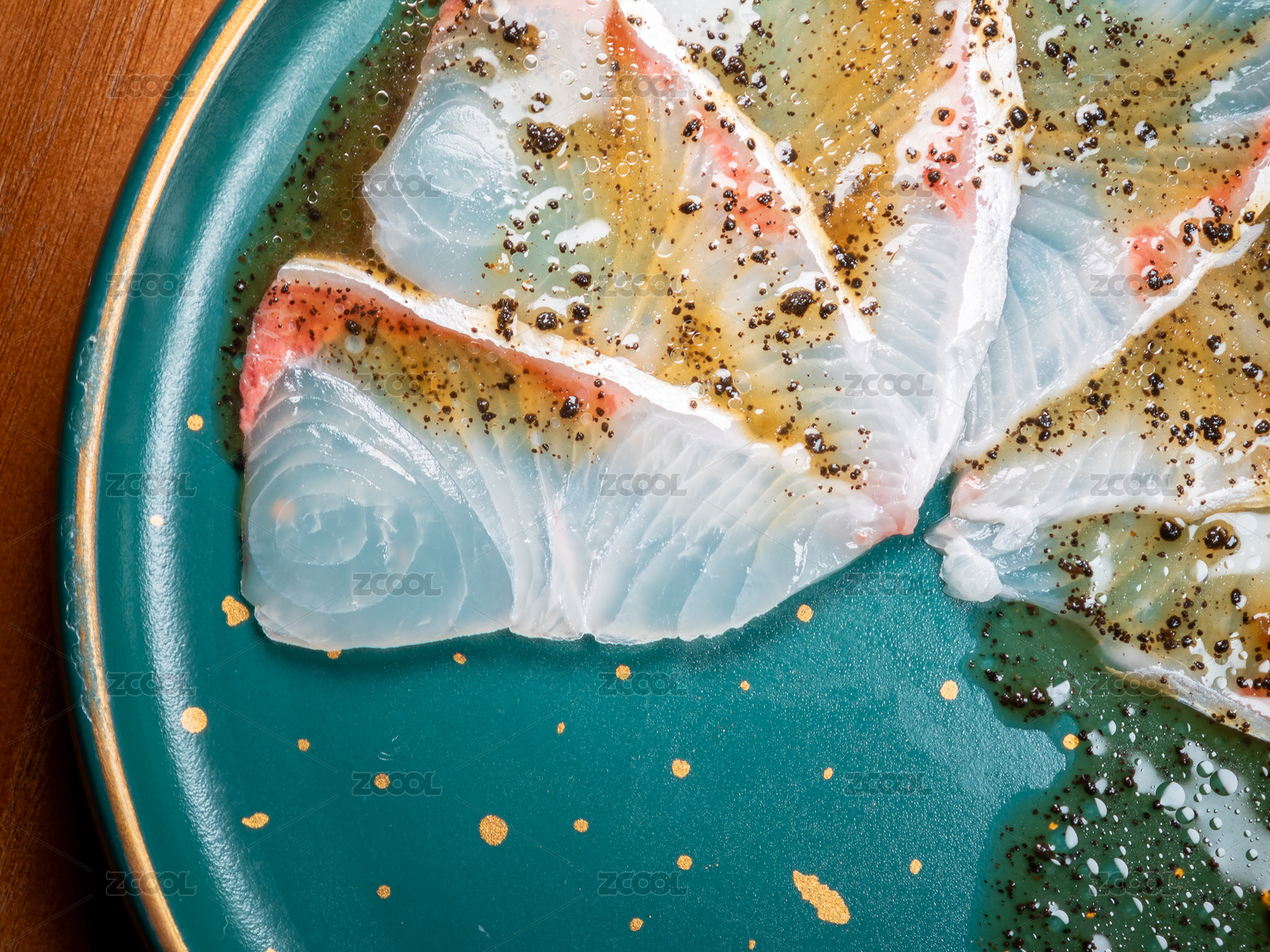 精致擺盤的白身魚刺身薄切配醬汁特寫